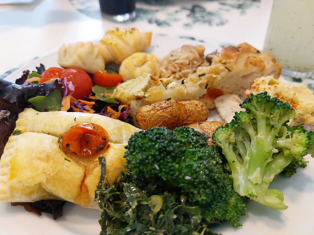 Buffet plate with chickpea curry, riasted veggies, smoked tofu, baked …