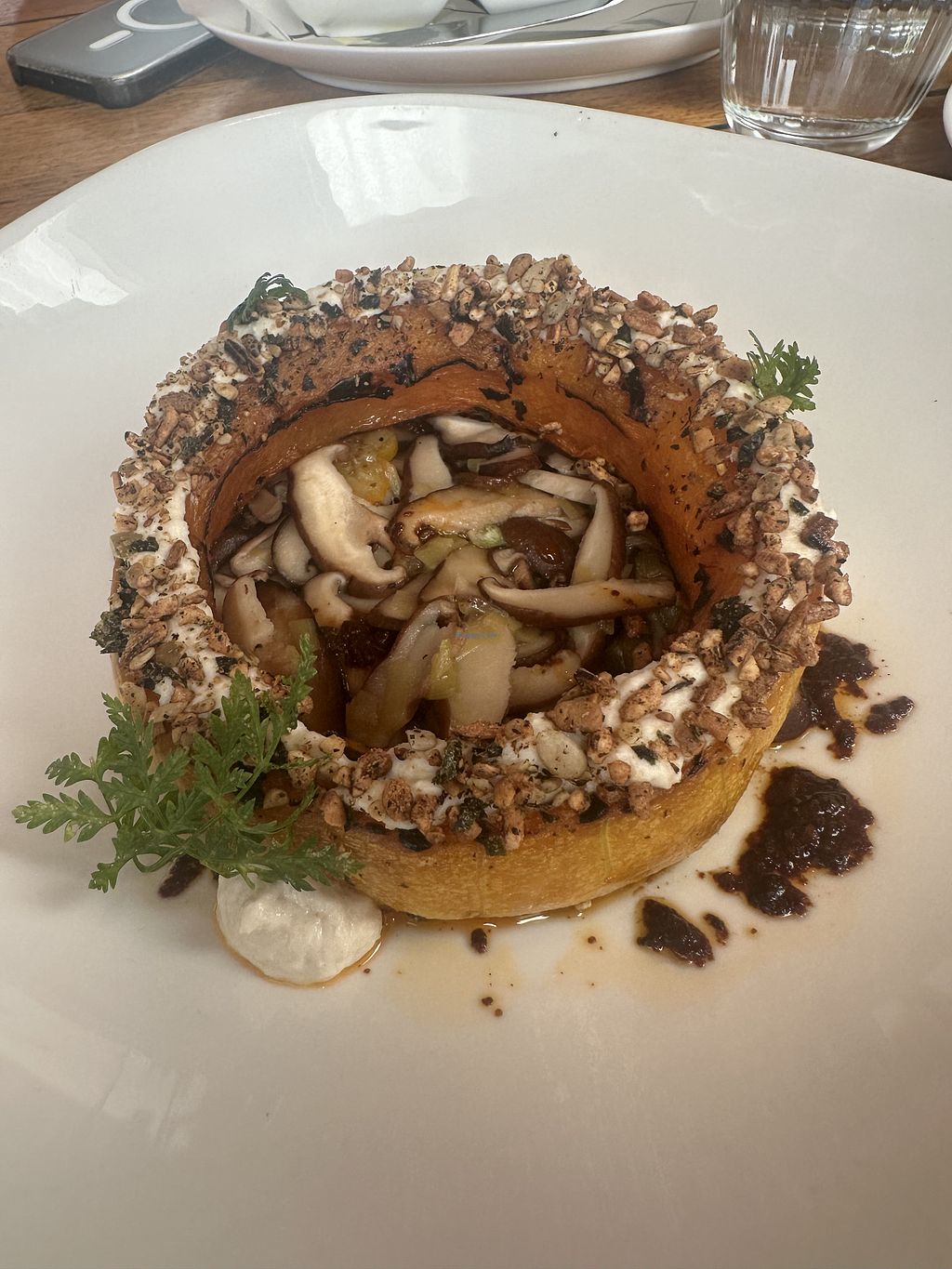 This is a very special place. The waitress was very attentive about my vegan requests. I chose the vegan burrata which was made from cashews and the pumpkin main which was already vegan. I quite enjoyed the burrata but the pumpkin dish was pretty tasteless. Everything looked beautiful and the evening was great. All the carnivores at the table loved their food.