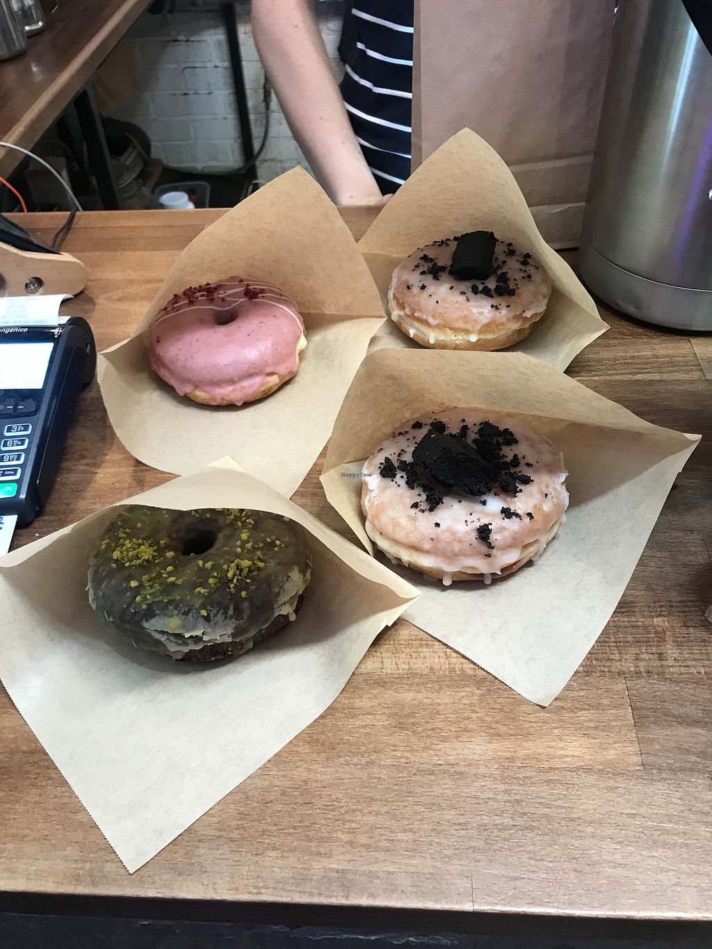 I was so happy to find out that this place sells vegan donuts! They have three vegan options per day (clearly labelled), plus the cinnamon balls on the counter are vegan too. When I was in they had a chocolate filled donut and two ring ones: peanut butter, and lavender. We didn't try lavender, but the other two were delicious!