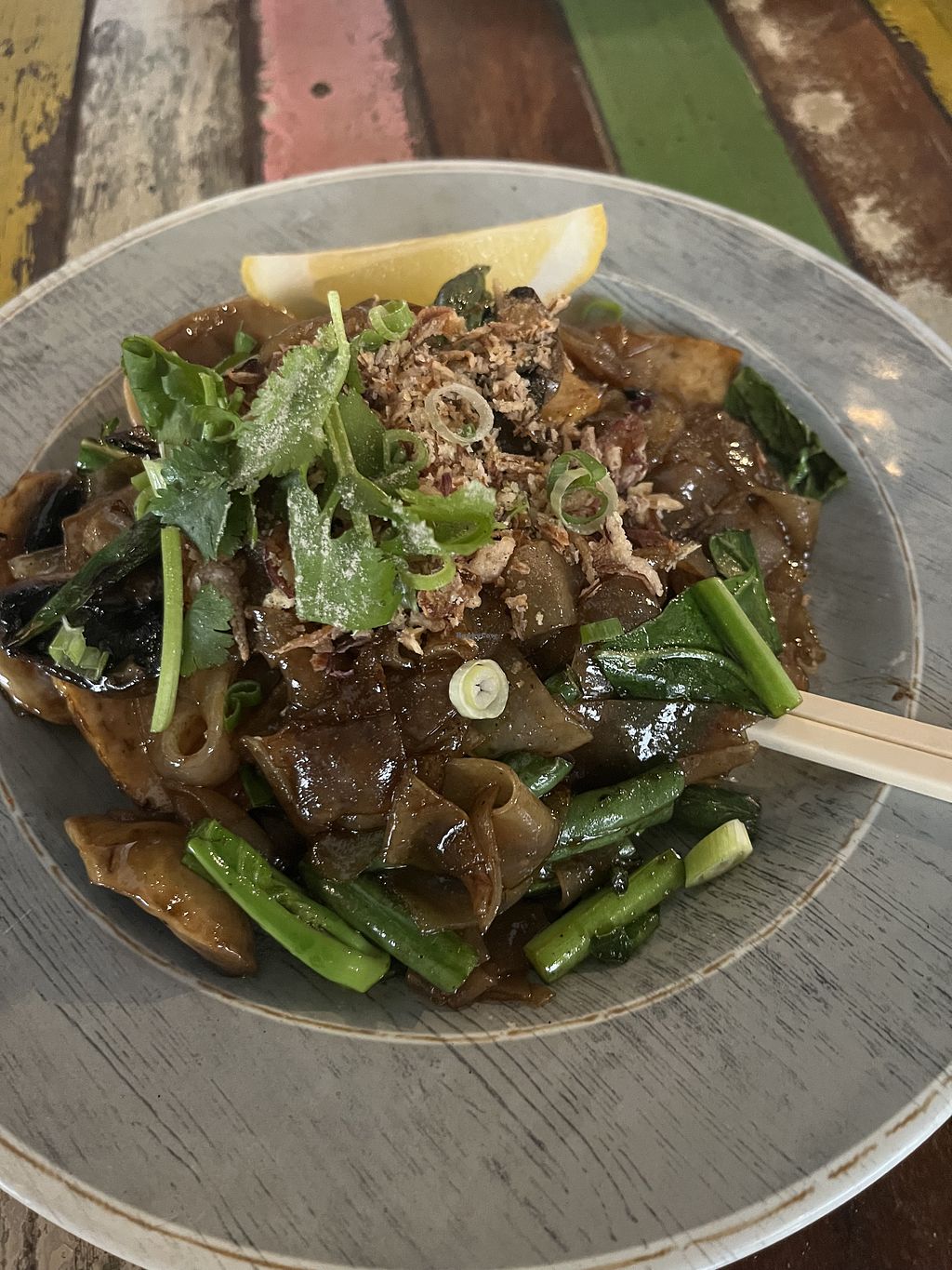 We are visiting our son in Brisbane and he suggested we try a really good Thai restaurant. We arrived at 5:10 on a Friday evening (they open at 5:30) and there was already a line of people waiting. A good sign. We were quickly seated when they opened. They have a vegan menu (thank you to the Happy Cow reviewer that mentioned that!) and I ordered the Pad See Ew with Tofu. It was delicious.