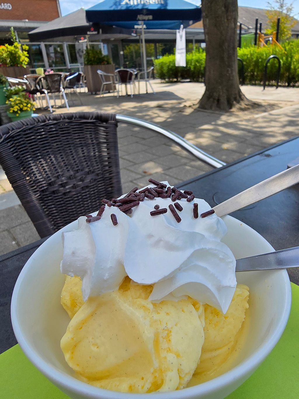- cococnut icecream with whip cream and chocolate sauce 6€