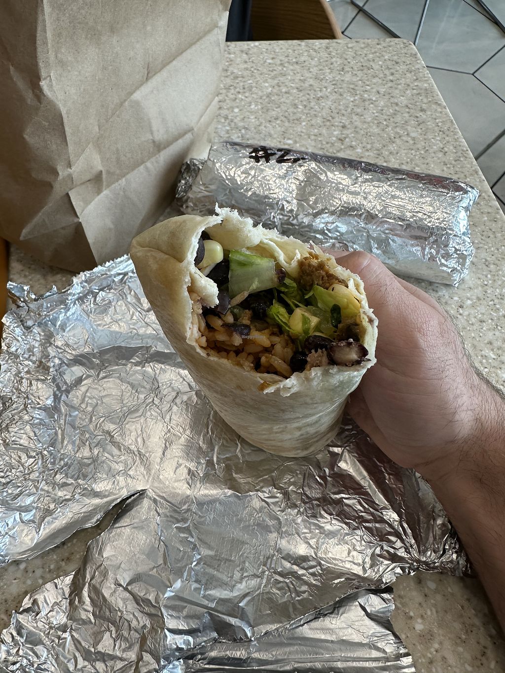 I had the burrito with impossible meat, rice, beans and veggies. Guacamole is an additional charge. Only downside was/is the price. One burrito with no sides or drinks cost me nearly $19.
