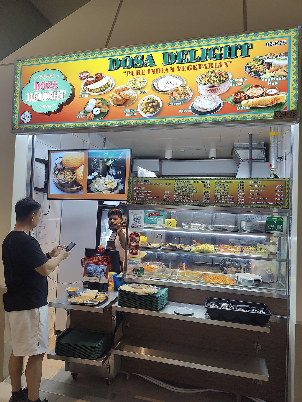 Lacto Indian Take-out Breakfast Vegetarian Indian stall focusing on South Indian specialities like Plain Dosai, Masala Dosai, Paper Dosa, Idly Set, Chappati Set, and Vegetable Biryani. The menu also lists Lemon Rice and Tamarind Rice. Open Mon-Sun 7:00am-9:00pm. More