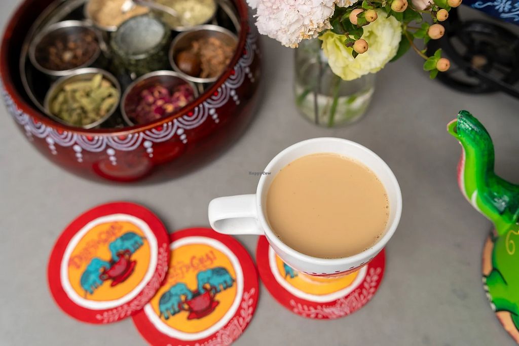 A modern chai store and community space. The menu features handcrafted, house-brewed chai blends. Signature options include the "Signature Masala Chai" (bold black tea with warming spices), "Cardamom Hug Chai," and unique twists like "Rose & Saffron Chai". The café also offers iced chai variations such as "Iced Mango Chai Fizz" and "Iced Coconut Rose Masala Chai". Oat milk is available for several drinks, such as the "Maple Brown Sugar Oat Milk Masala Chai". Open Wed-Fri 11:00am-4:00pm, Sat-Sun 11:00am-5:00pm. Closed Mon & Tue.
