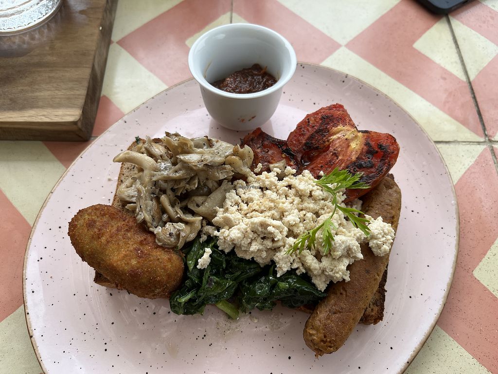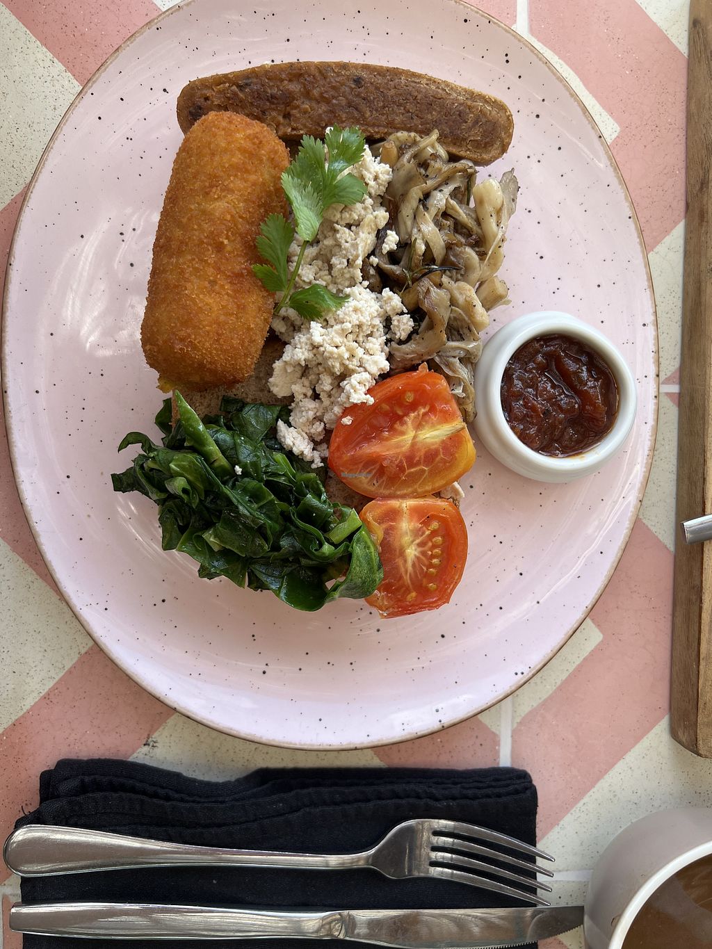 Vegan shala breakfast - Scrambled tofu, vegan sausage, mushrooms