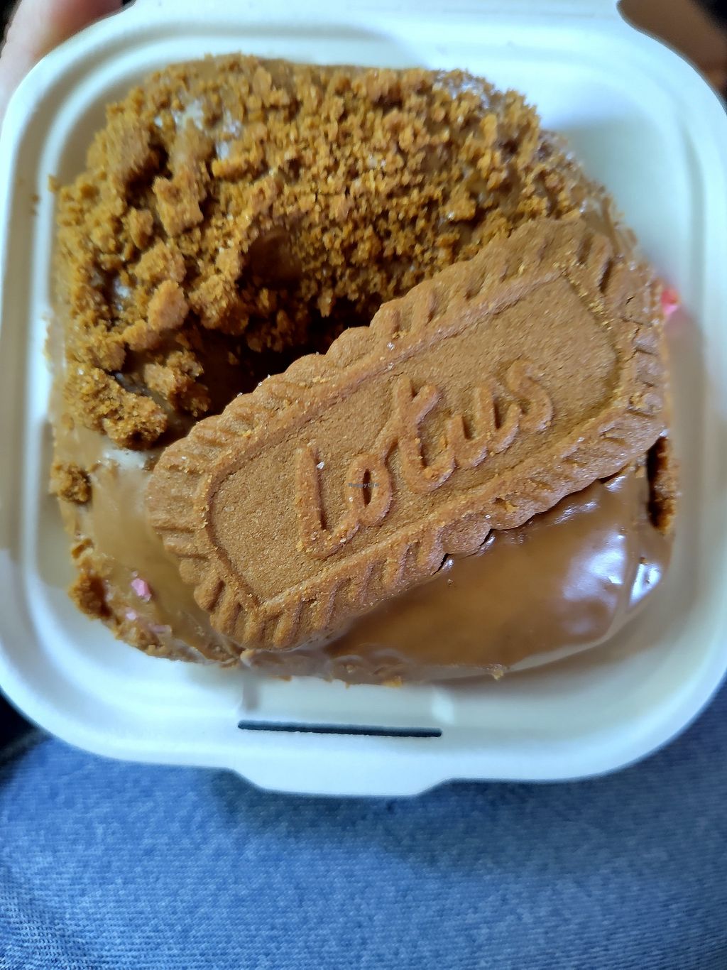 They have two vegan doughnuts, a biscoff and one they call the homer which is pink with sprinkles and strawberry flavour.