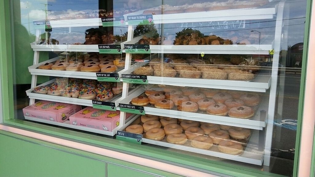 Doughnut and shake shop chain offering usually around 2 vegan doughnuts. Vegan dough is produced separately to the regular dough and is also fried separately. Uses rice bran oil. Reported closed, Mar 2018.