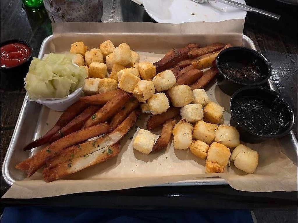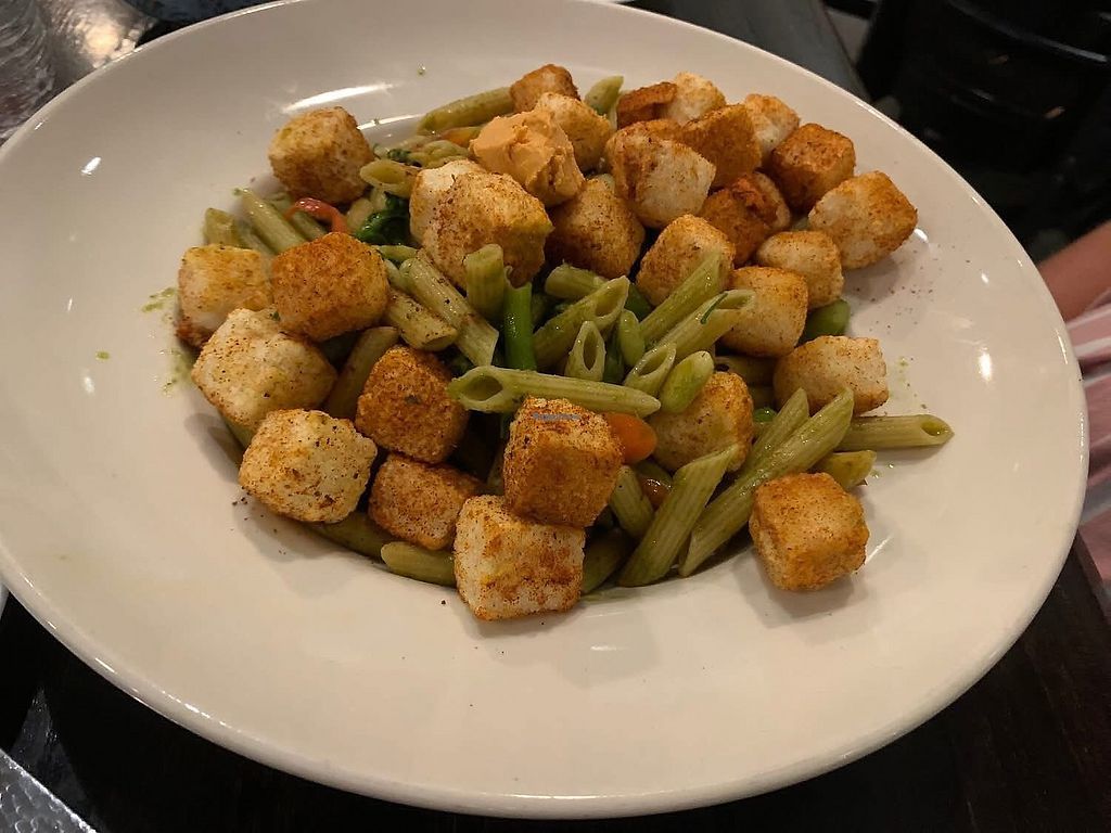 Chef's vegan creation for us - red lentil pasta, fried tofu, maitake m…