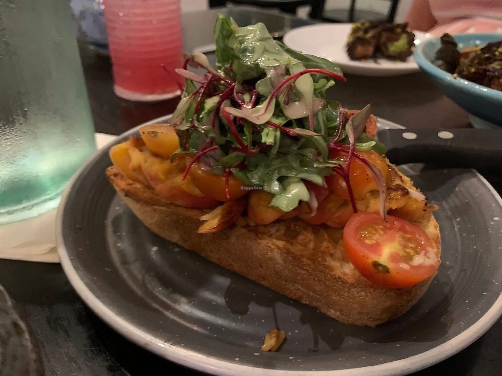 Seasonal sourdough toast with vegan cheese, roasted peaches, tomatoes,…