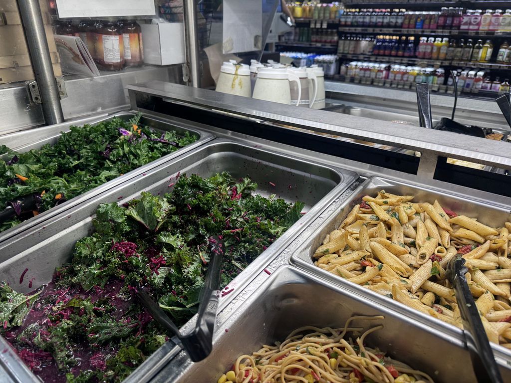The food area is immediately to the right upon entering the store. There is a salad bar, hot foods bar, deli counter, and service counter where you can order sandwiches, wraps, veggie burgers, juices and smoothies.