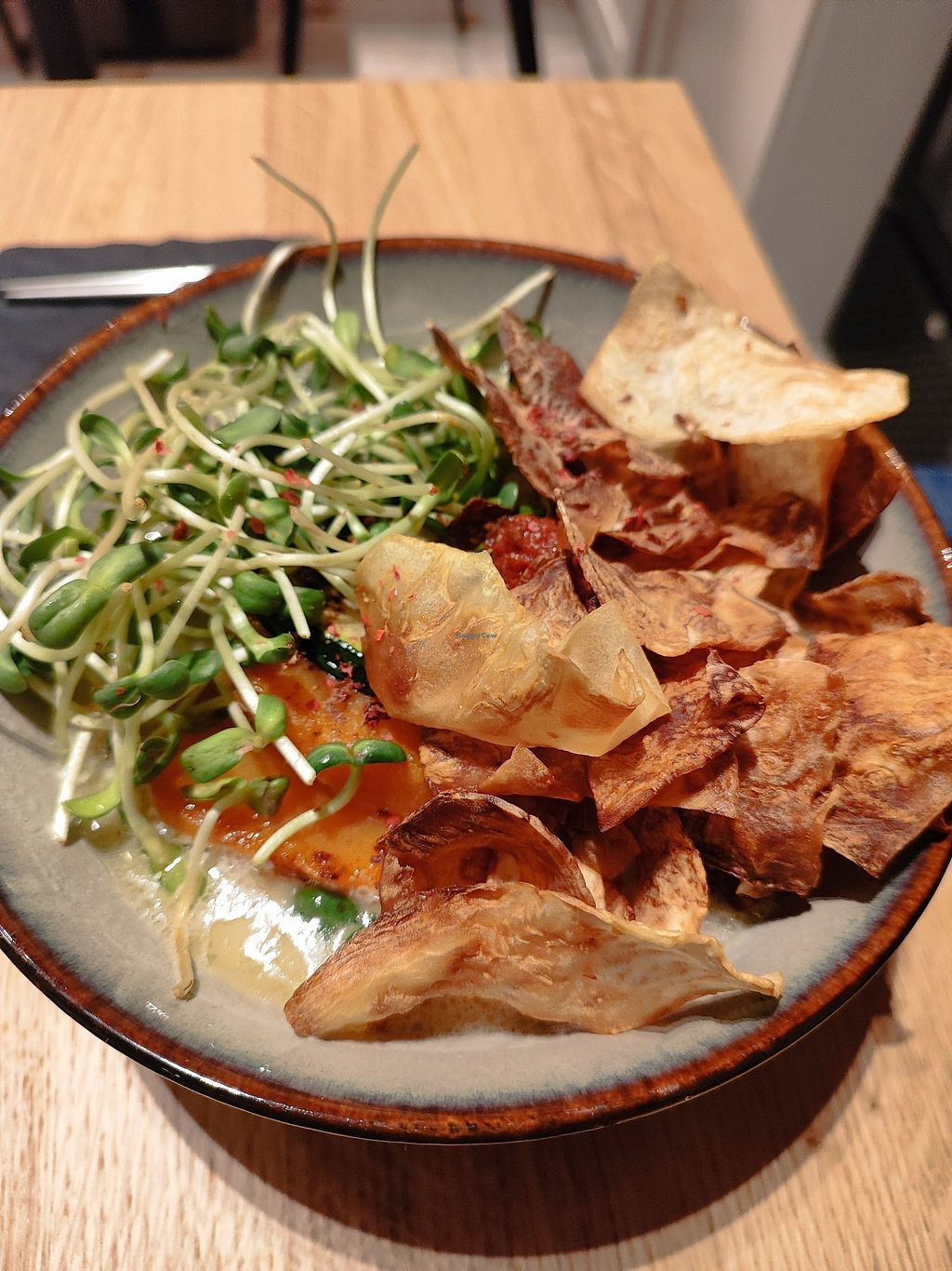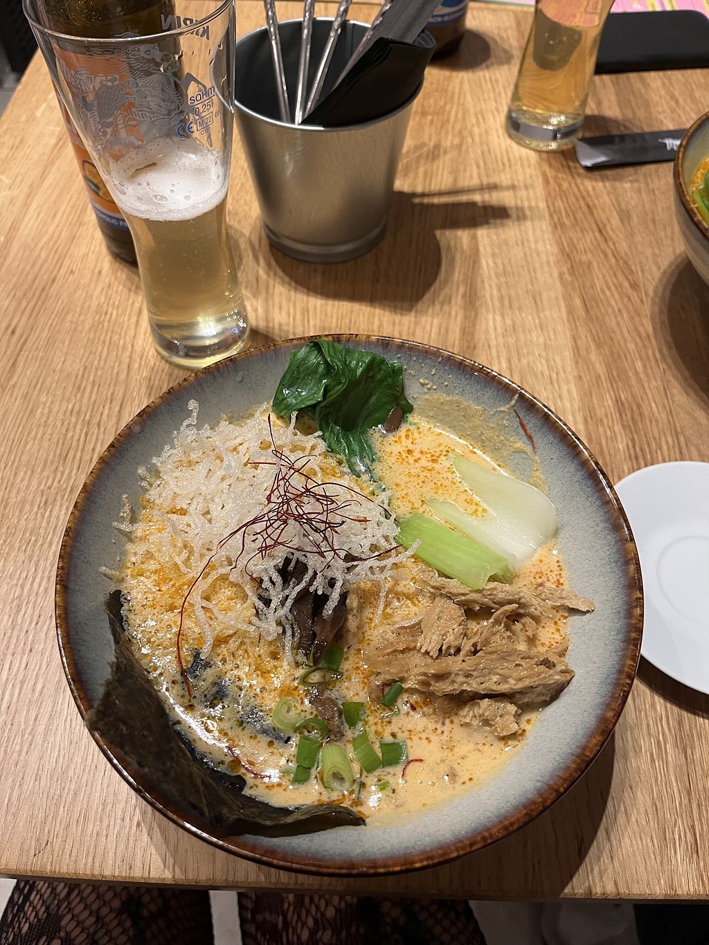 We had the Cream on - creamy Shoyu Ramen - and the Tantanmen. The cream on was pretty mild, definitely pleasent but not very memorable. It was laden with toppings and the portion was generous. There was a massive piece of sweet potato in it, in addition to the noodles. So you definitely don't need an appetizer. The Tantanmen was a little disappointing. It was quite hot and creamy, but the flavours werent that interesting, although my partner liked it. The toppings were icecold and I had to dunk them into the broth for while to get them a little warm. The vegan meat chunks werent very flavourful or tasty either. It was still overall okay, but not something I would order again. Overall, this is still a good place and we would go here again to try another Ramen again, but on this occasion it was a mixed bag. As it stands, we'd give it 3.5 Stars. Friendly service.
