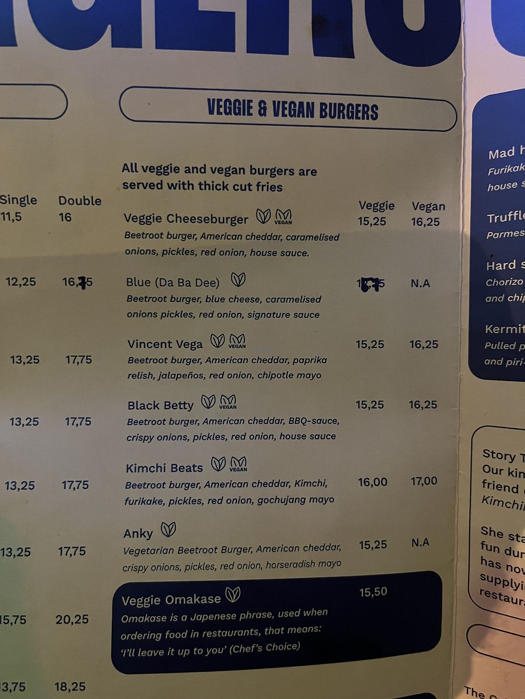 Serves meat, vegan options available. Burger restaurant offering a variety of vegan burgers. Also serves additional vegan sauces on request. Open Wed-Thu 17:00-22:00, Fri-Sat 12:00-22:00, Sun 12:00-21:00. Closed Mon-Tue.