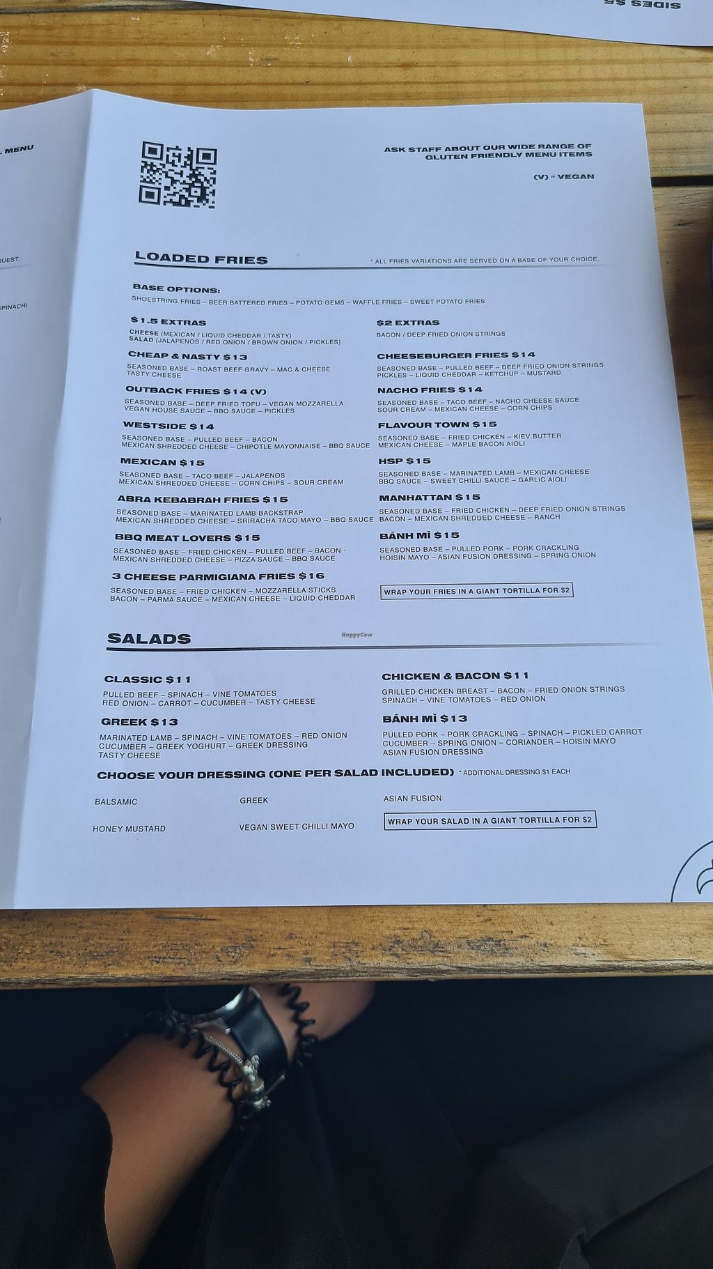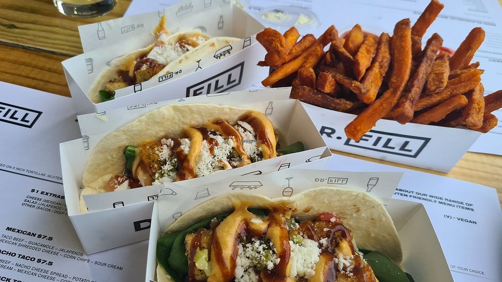 Serves meat, vegan options available. Offers multiple vegan dishes including vegan loaded fries, vegan tacos, sides, and dessert. Has vegan cheese. Reported closed December 2023.