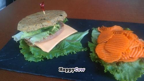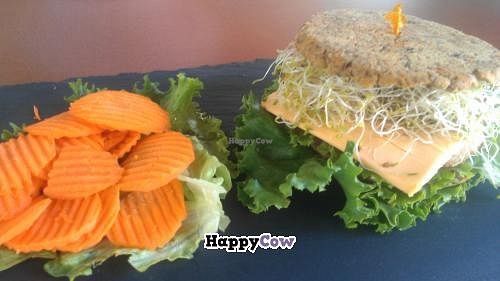 Alfalfa patty burger with raw carrot chips