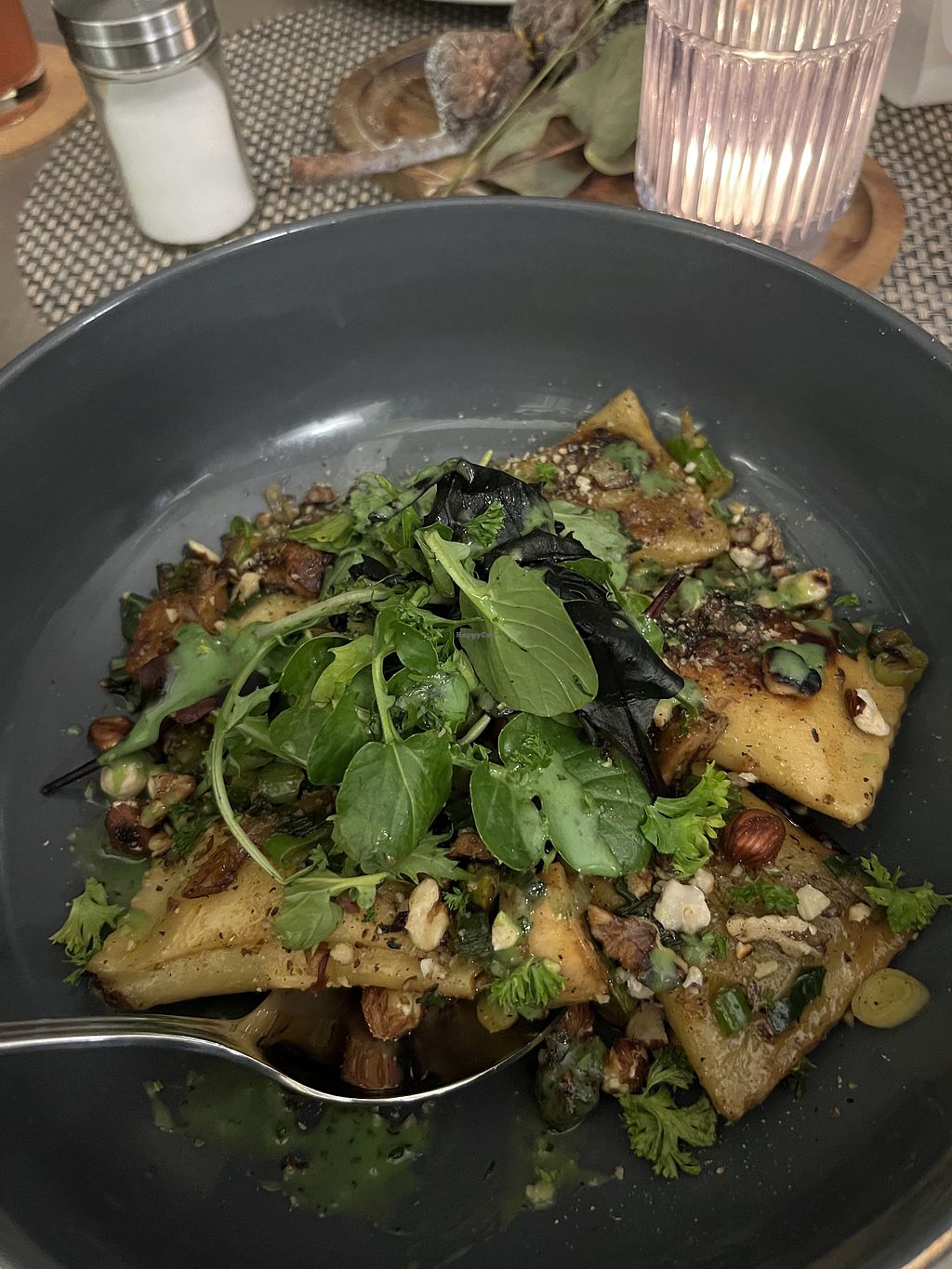 Spinach Dumplings on lentil-apple salad with fried rocket and nuts