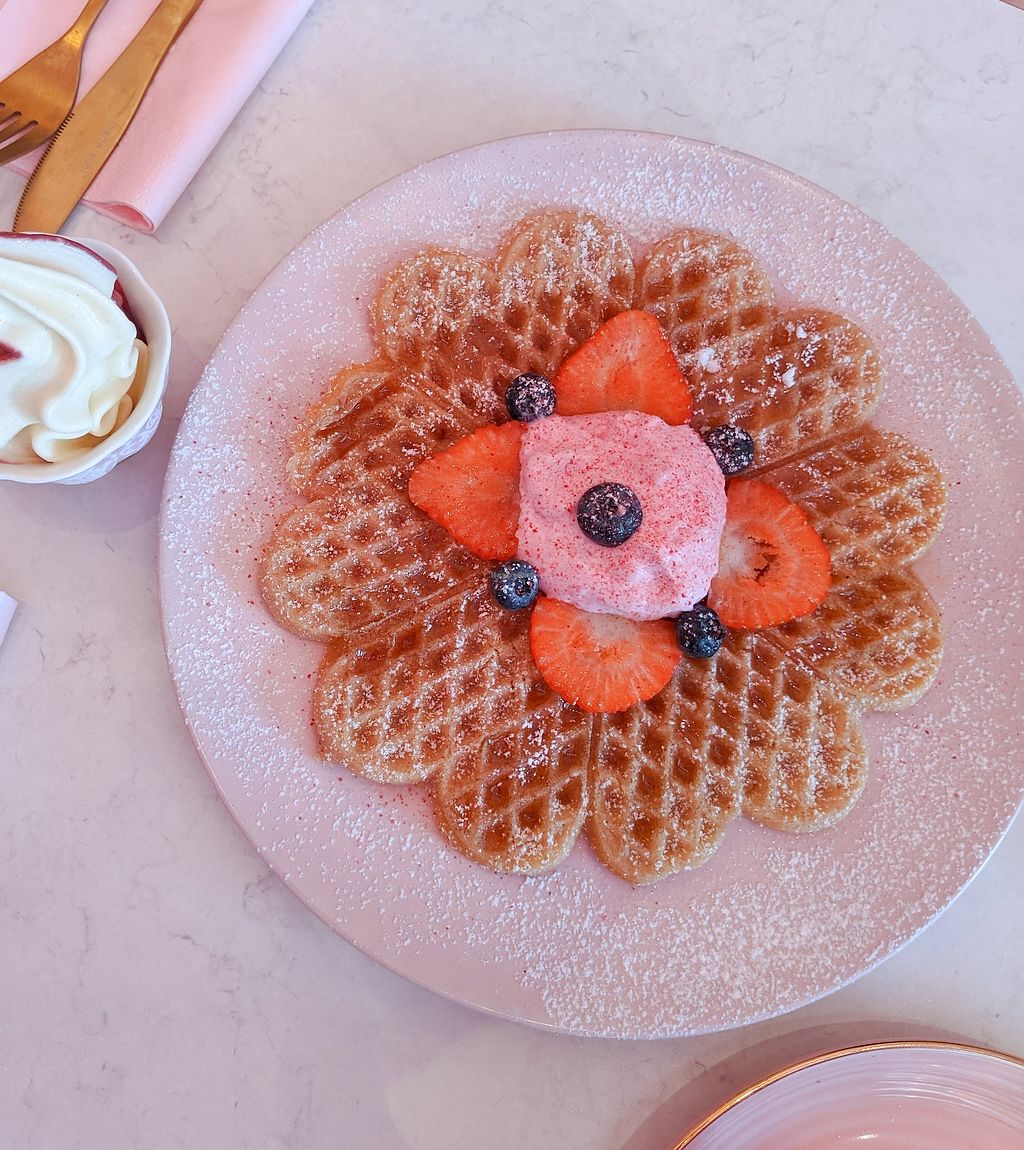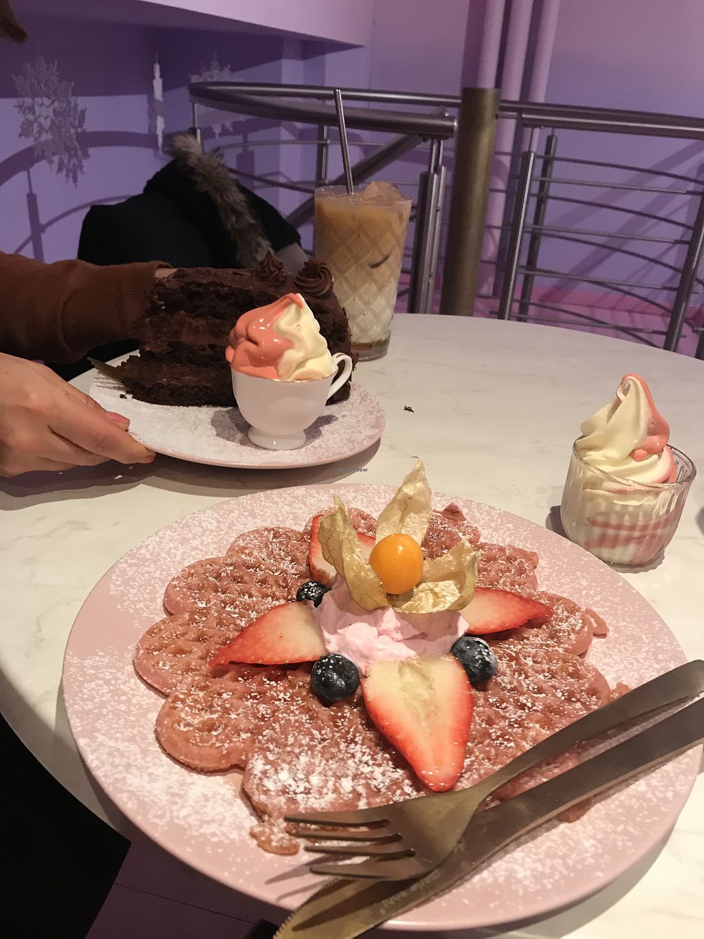Super cute cafe, very instagram-able! The pink waffles are amazing and comes with pink whipped cream and a side of ice cream.
