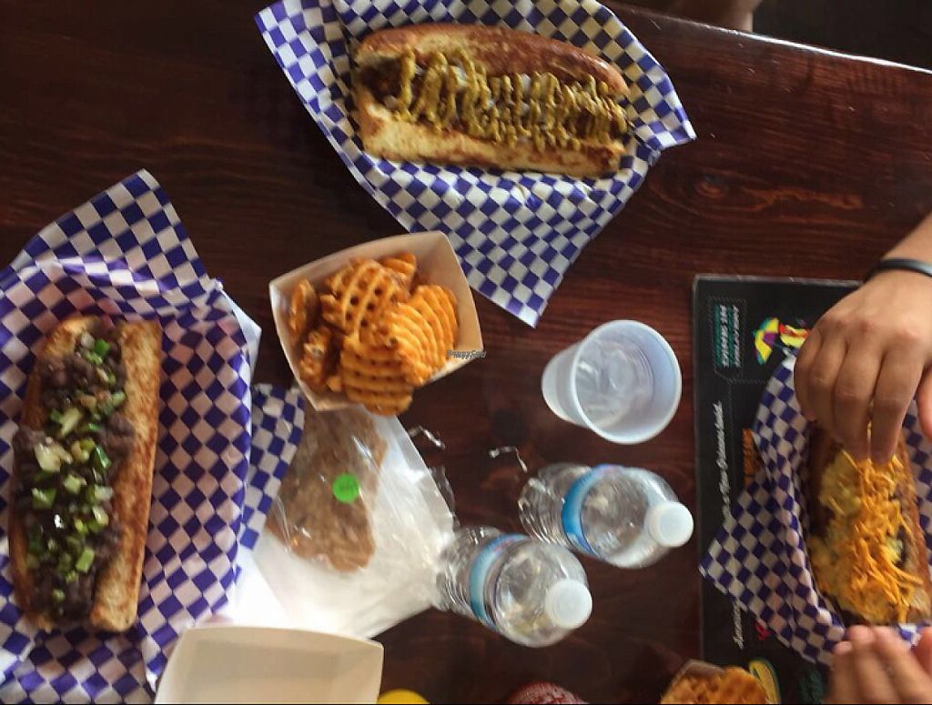 Kielbasa Vegan Dog with relish and mustard. Also seasoned waffle fries…