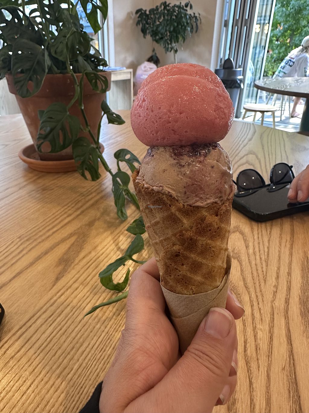 I had a regular which allowed you two flavours so I went with raspberry lychee sorbet and the chocolate blackberry biscuit in a gluten free cone. The sorbet was fine but a tiny bit grainy. The chocolate blackberry was absolutely delicious. Staff were helpful and knew about dietaries with no problem