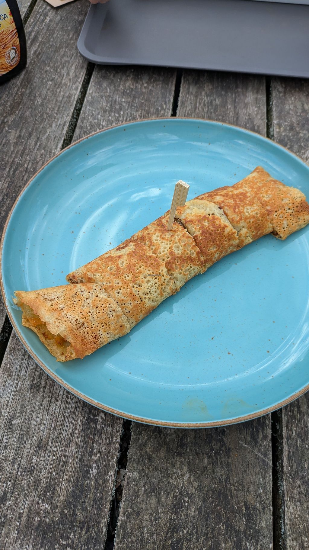 Pancake filled with apple mix (apples, almonds, raisins, cinnamon)