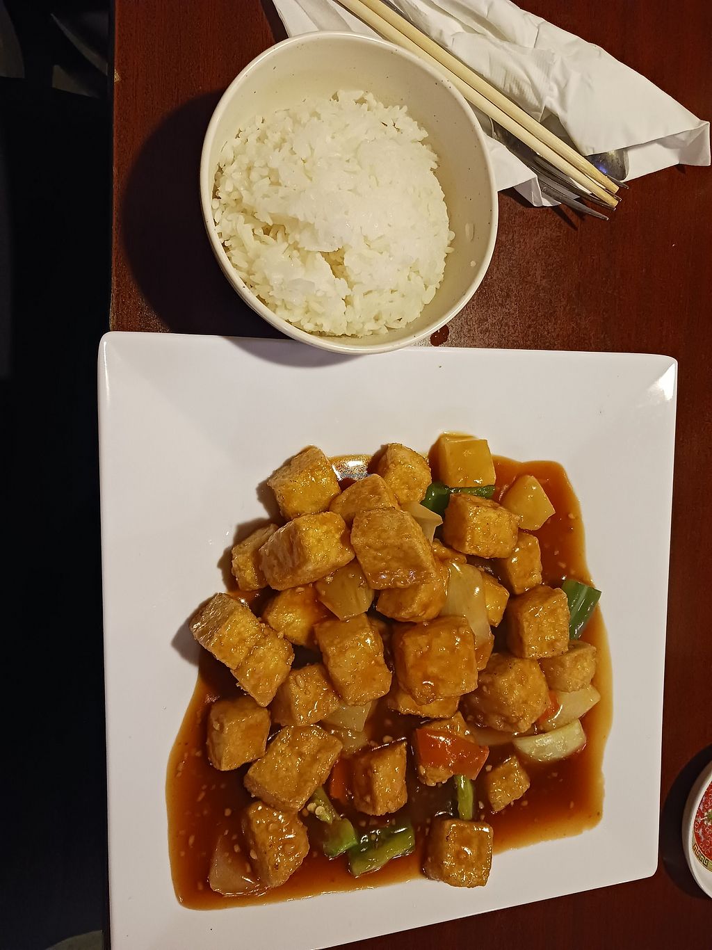 Few options, got vegetable spring rolls, vegetable sushi roll, and pineapple sweet and sour tofu (listed as chicken dish, waitress guessed substitute tofu before i even said it, love the service!)