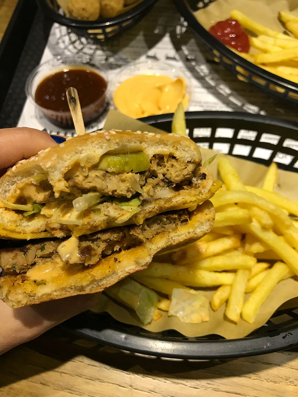 There was nobody ahead of us to be served today and we waited 40minutes for the food. It is very good but it is very pricey. The burgers are lovely and meaty but the cheese is just violife so £8.50 for a burger is quite steep. I had a bbq chicken wrap too which the chicken is delicious but it is overpriced. They also charge for sauces which we don’t believe is right.