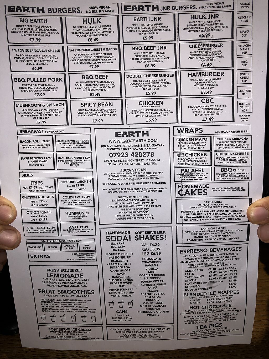 Everything is meat & dairy free. Offers burgers & chips. Milkshakes, sodas, cakes... Highly recommend.