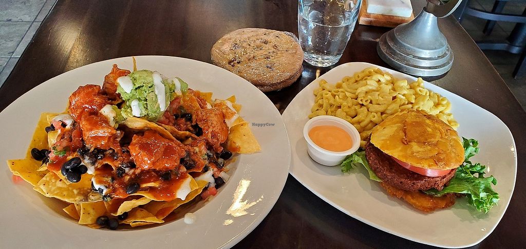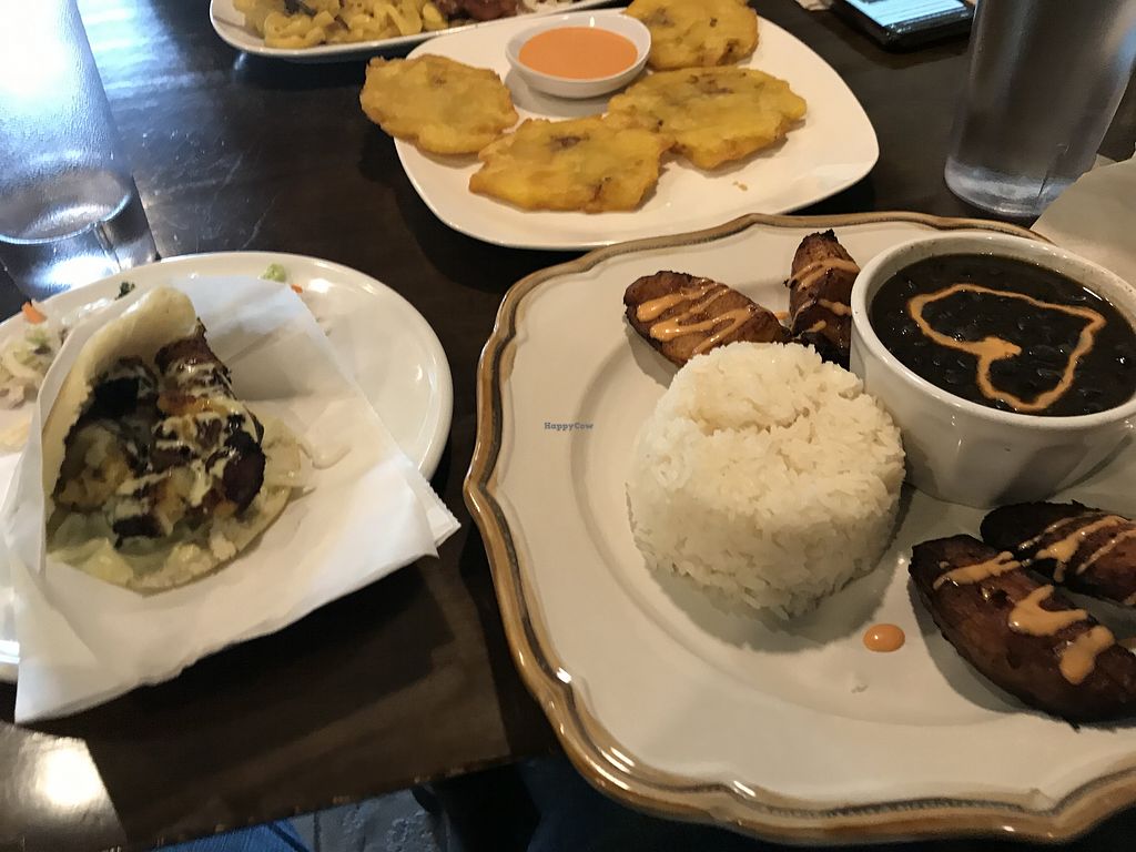 Food and service was great. We had the Plato principal, Buffalo cauliflower, veggie empanadas, nachos, yucca fries and beyond burgers. Our favorite dishes were the tostones and the Buffalo cauliflower. Definitely check it out if you’re in the area.