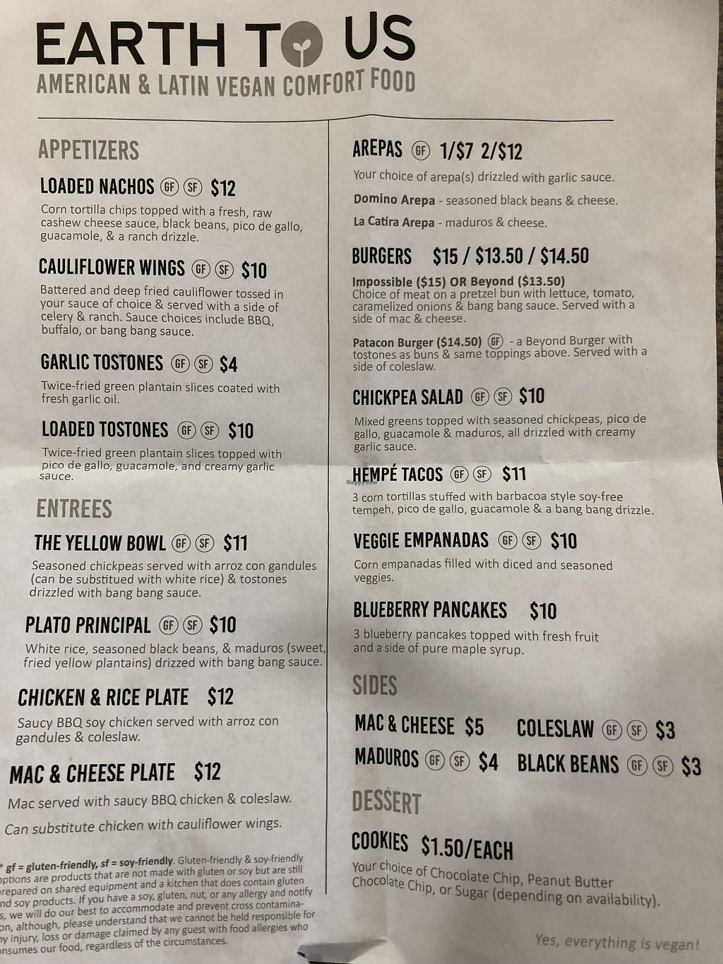 We love Earth To Us! We love everything we’ve tasted so far, especially the arepas and cauliflower wings. The owners are really sweet too!