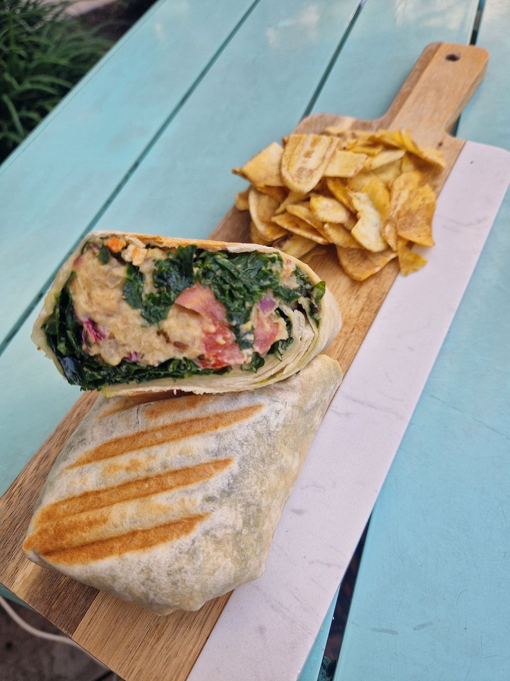 I had toonah wrap, it had a really food texture and flavour! Really food imitation of tuna. Sat outside in the shade, great staff also!