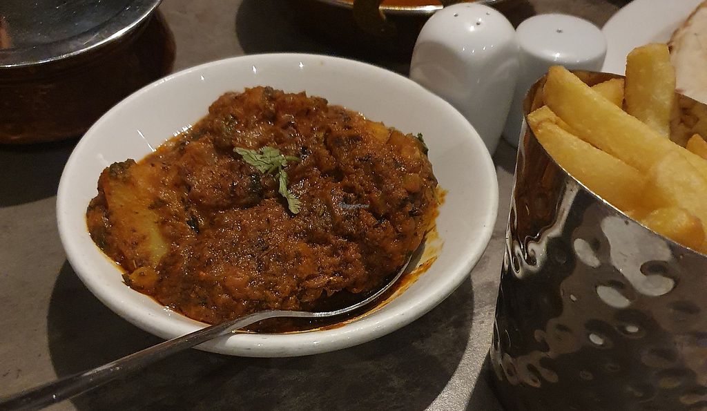Serves meat, vegan options available. Indian restaurant offering a few vegetarian items that are or can be made vegan such as saag aloo, Bombay aloo, aloo methi, tarka dhal, saag baji, chana saag, aloo gobi and more. Specify no butter, ghee, cream or curd. Open Mon-Sun 17:00-23:00.