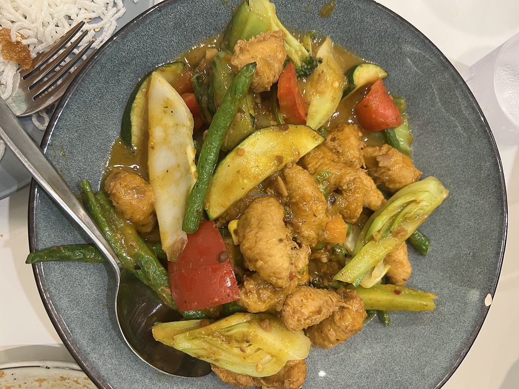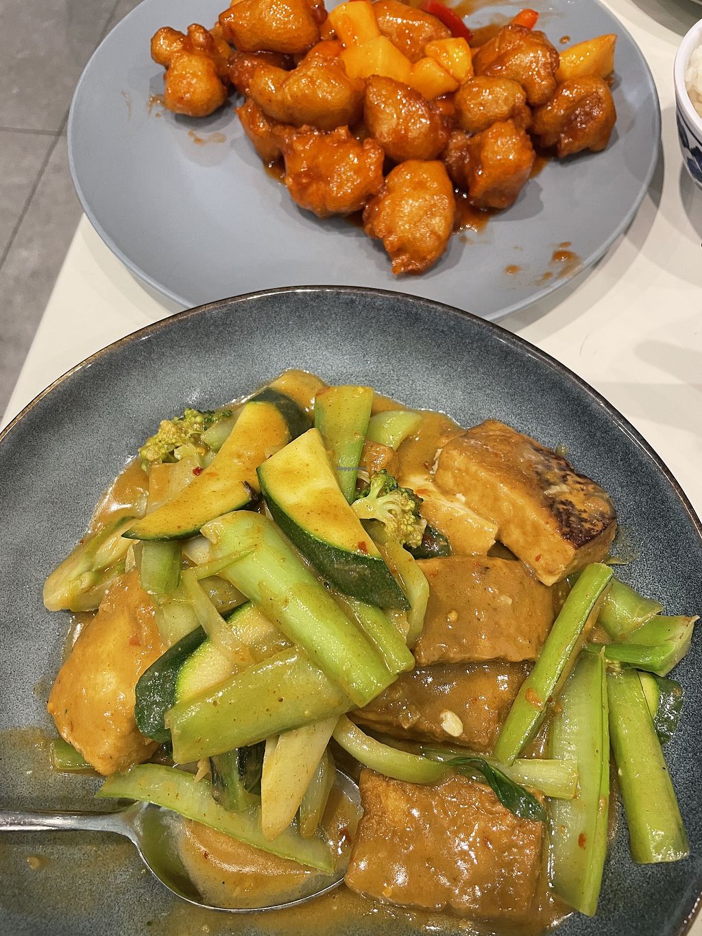 Sweet and sour pork, mixed veggie and tofu curry