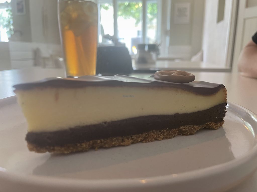 The cheesecake is perfect. It's creamy and the texture is spot on compared to what I remember regular cheesecake tasting like. It has some chocolate powder stuff on it that was good too, but I almost would prefer it without that. The chocolate crust is really good though and I would highly recommend getting a piece.