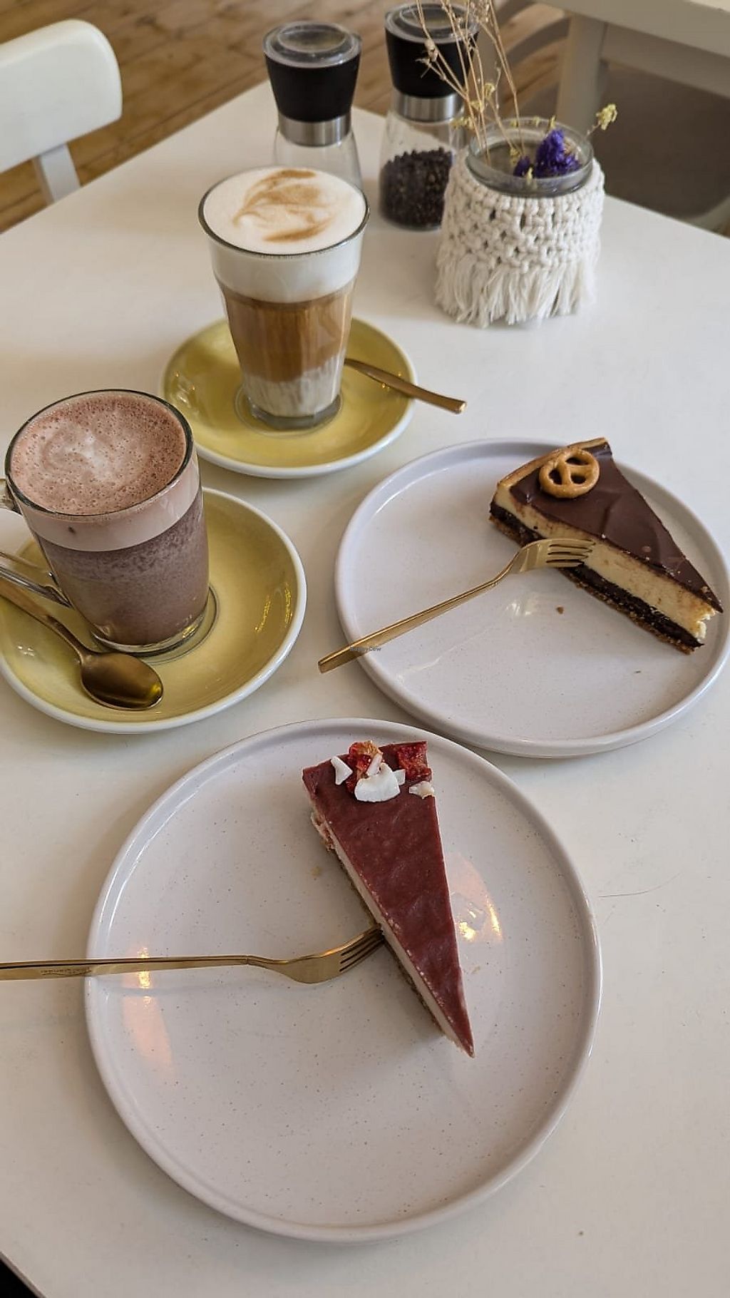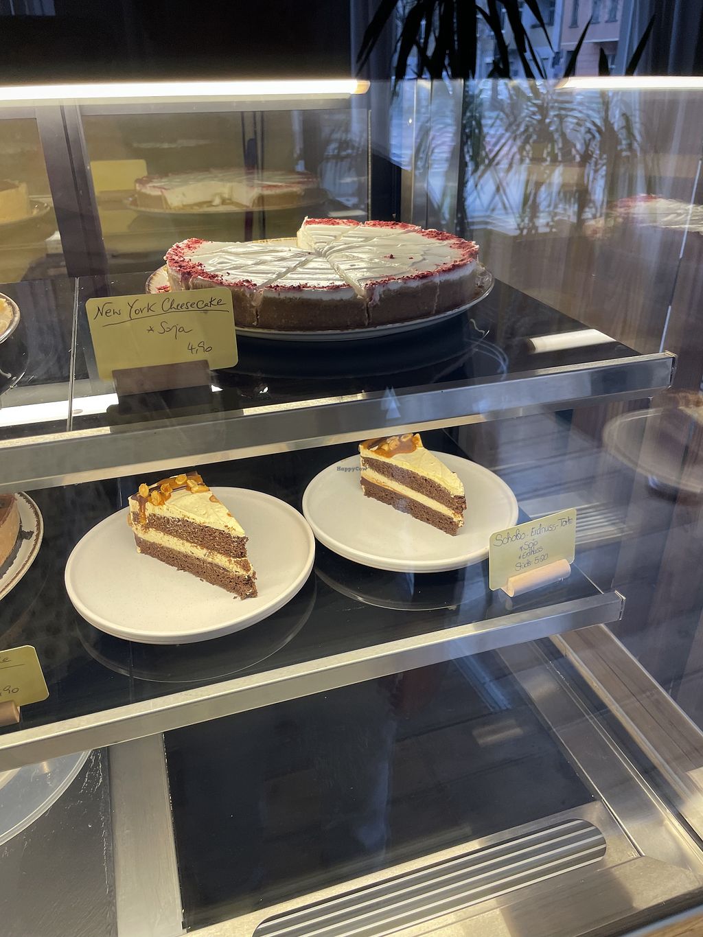 Wir haben zwei Kuchen, den Latte Macchiato und die heiße Schokolade probiert. Die Kuchen waren wirklich sehr lecker und das Preis-Leistungsverhältnis stimmt auch. Auf jeden Fall eine Empfehlung für alle, die plant based Kaffee und Kuchen in Berlin machen wollen!