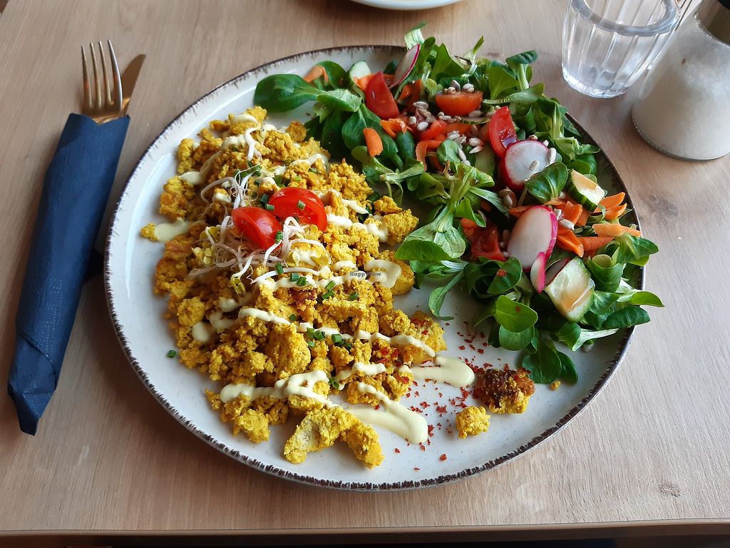 Cute cafe with a good selection of all vegan food. I asked for scrambled tofu (without bread and peas guacamole, which would have been the item on the menu) and they were kind enough to prepare it for me. The staff was super nice I general! Also the coffee and cake were tasty.
