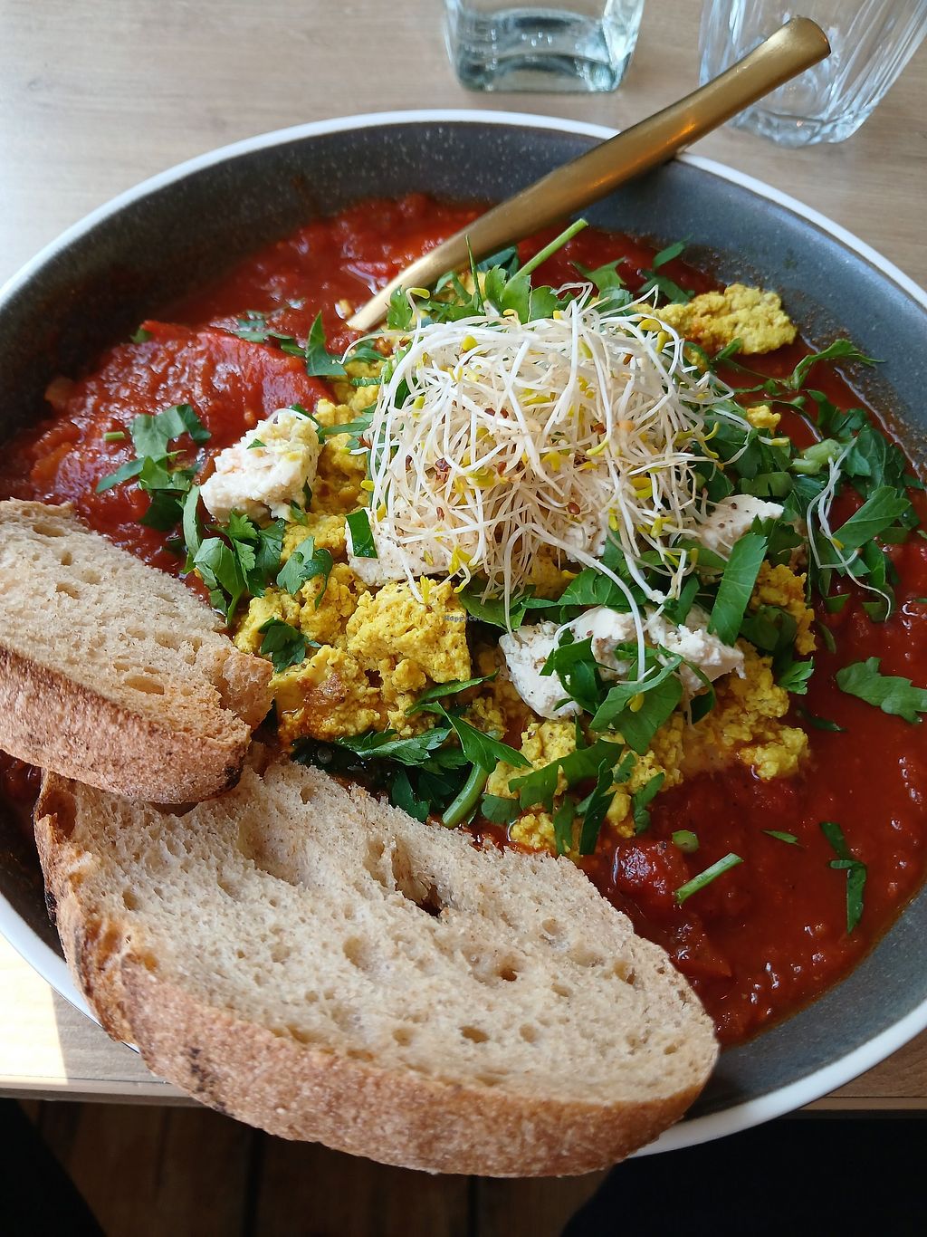 This vegan all day breakfast café is also entirely gluten-free. I had a great Tofu Shakshuka that came with home made sour dough bread. To be honest I was a bit worried at first because most gluten-free breads i've tried before weren't so good. But they got it right. The crispy toasted (german Graubrot style) bread was perfect for dipping into their lovely shakshuka sauce. Staff was super nice, too! Perfect way to start my day :)