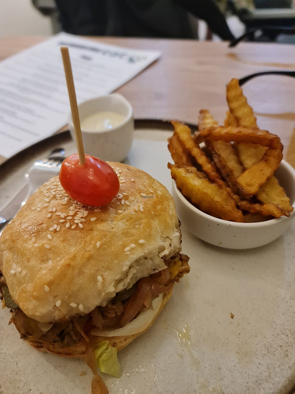 Vegan tuna melt made with pulled jackfruit, home made coleslaw.
