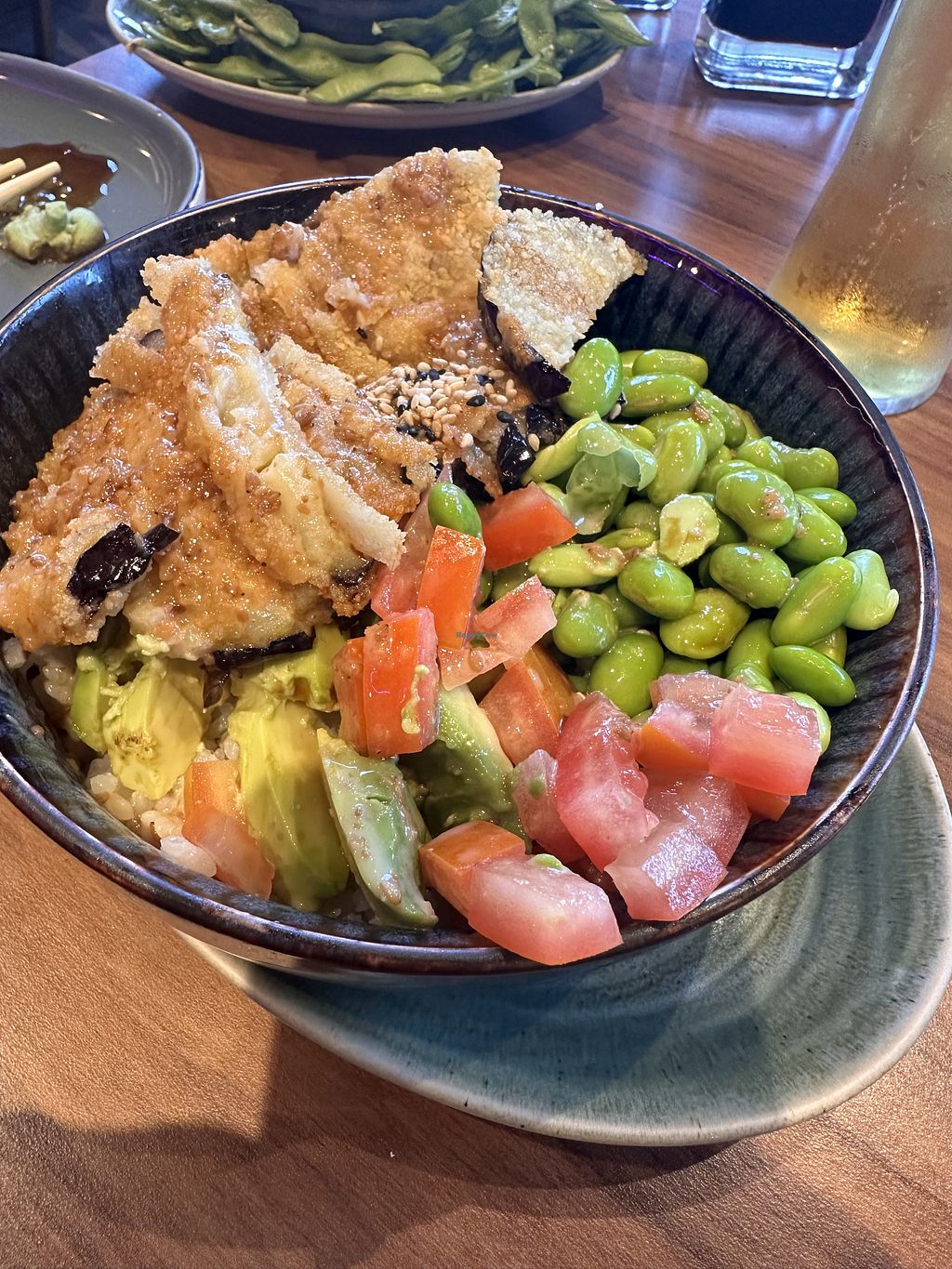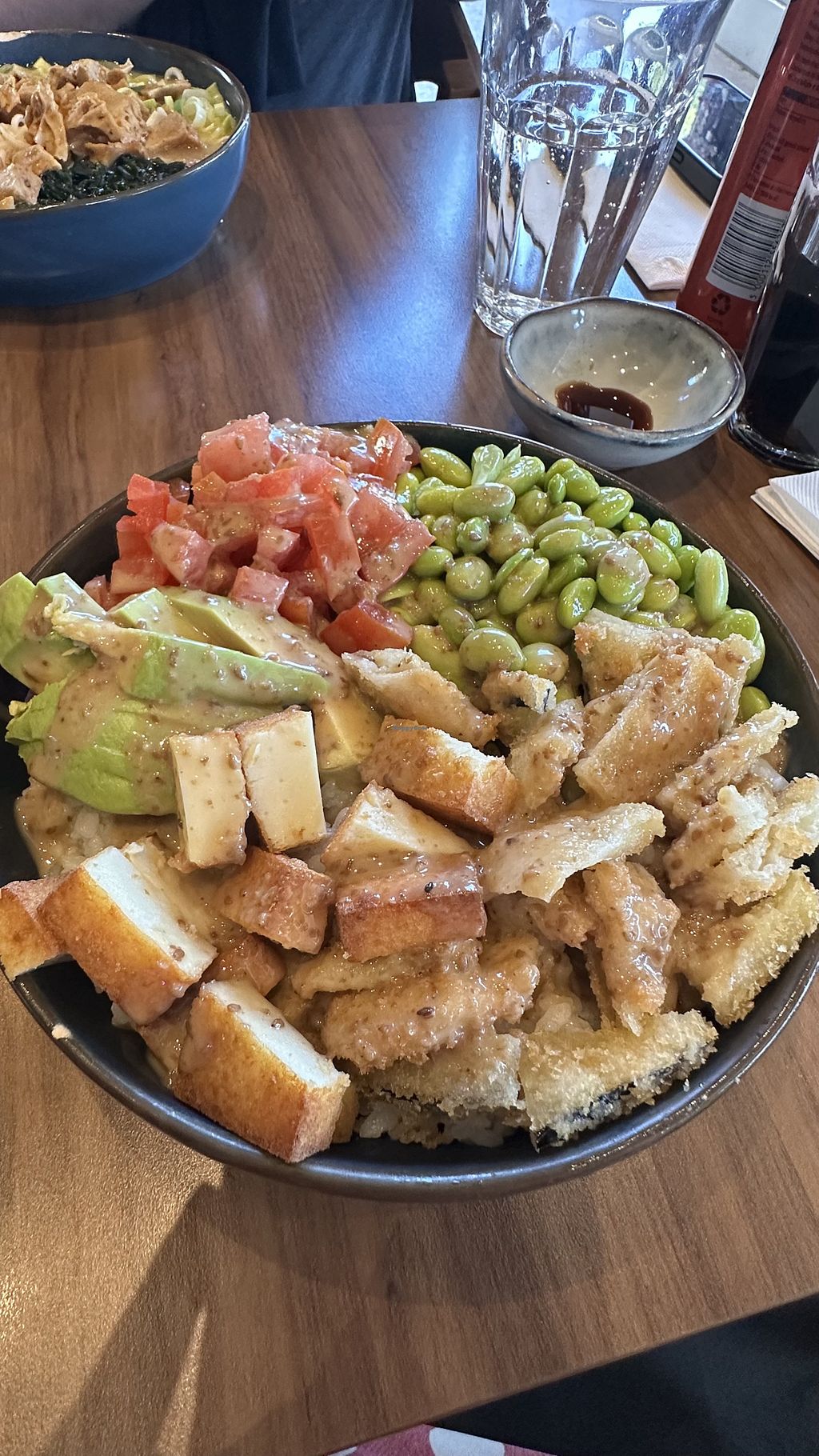 I wish they didn’t put tomatoes in the poke bowl… Edamame were nice.