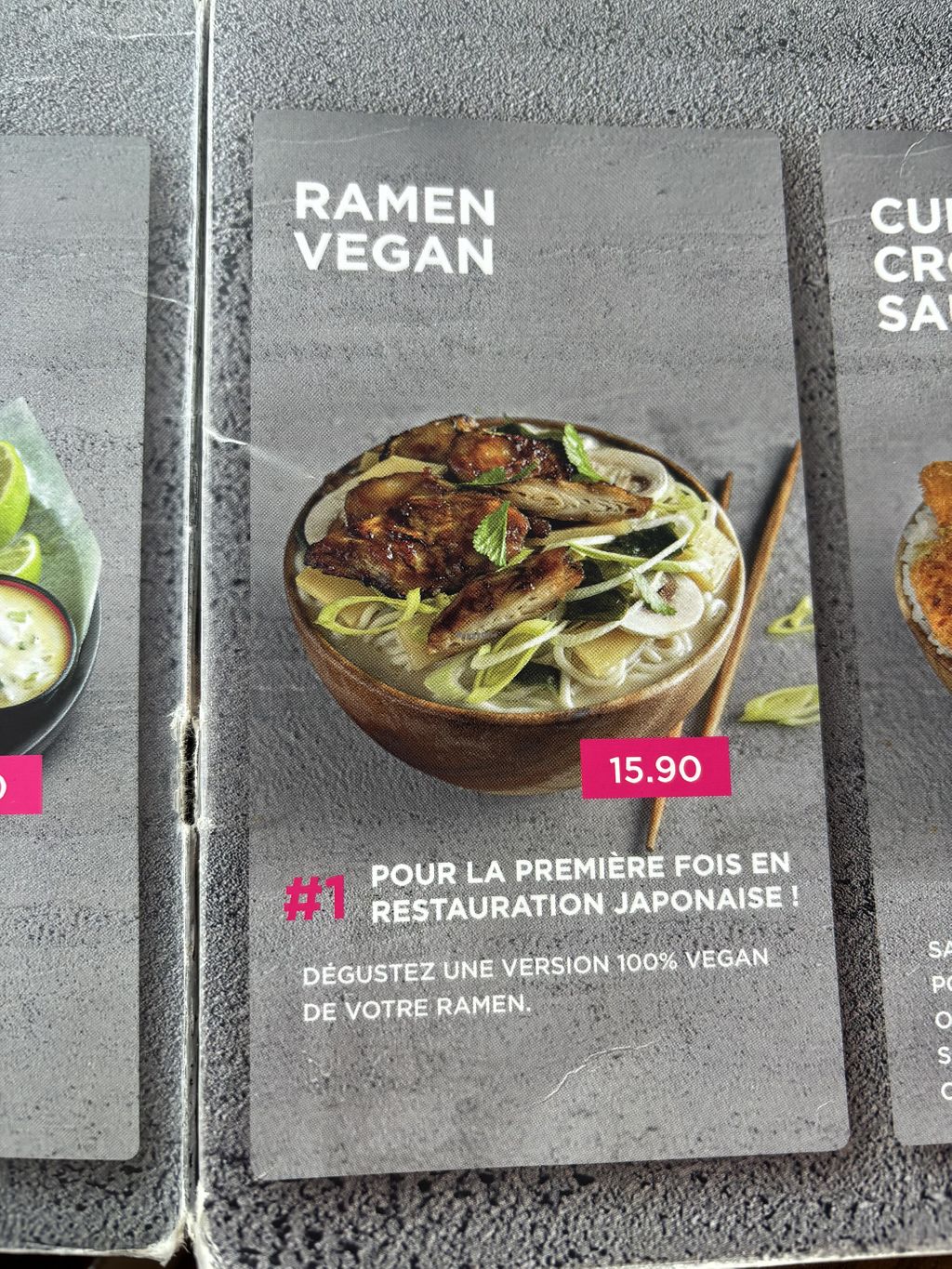 Seulement 3 options de maki vegan et plutôt simple. A part ça le bowl tofu est super bon et les ramen avec les aiguillettes happyvore génial ! J’ai même pu ajouter des aiguillettes supplémentaires dans mon poke bowl.
