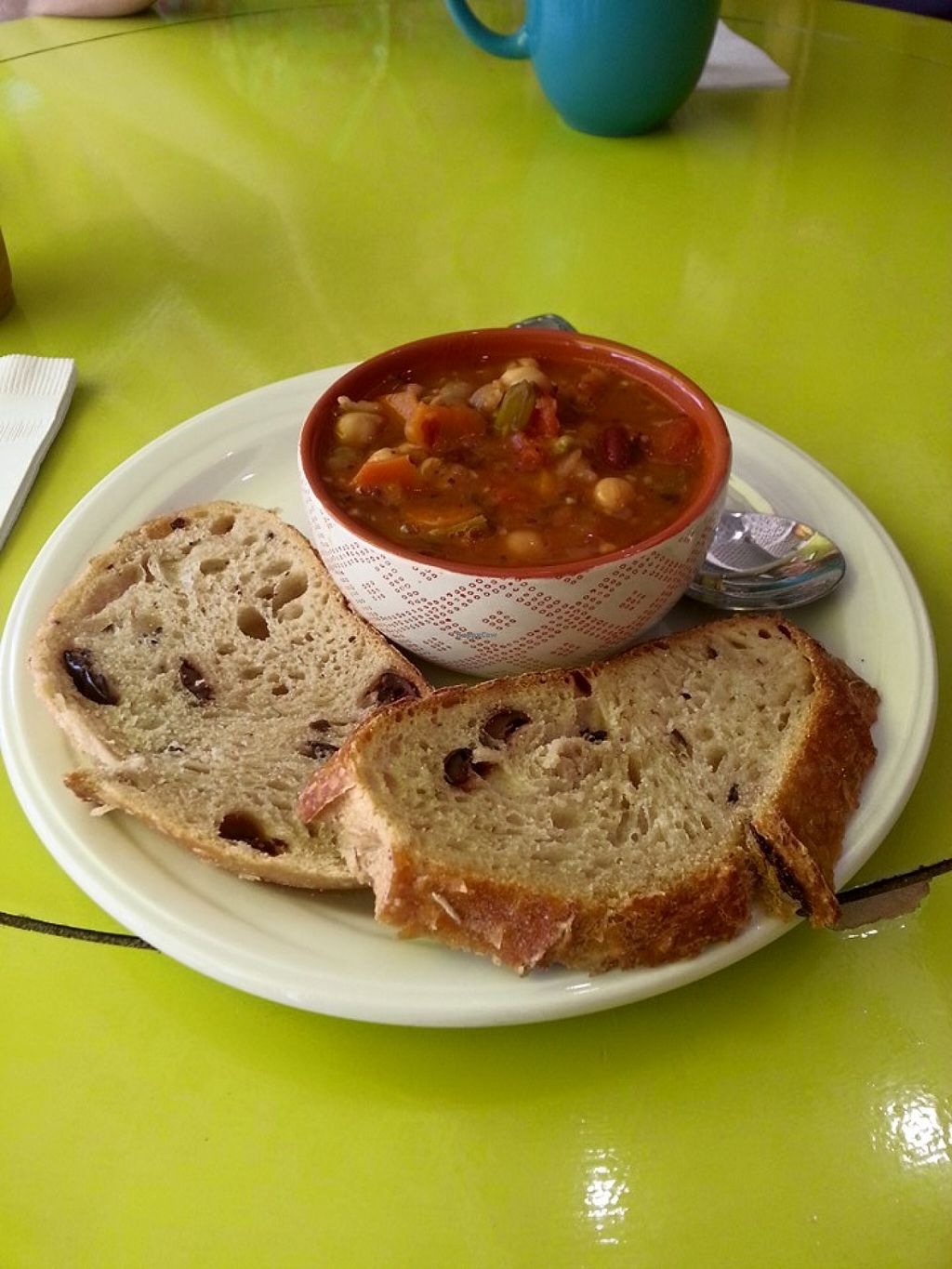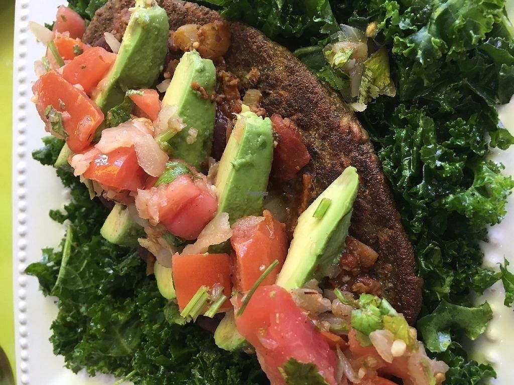 Mex Veggie Burger Special burger over marinated kale with chili, pic…