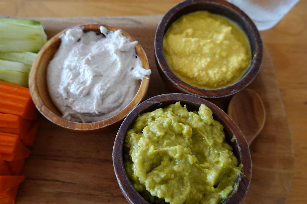 Guac, hummus and cheese dips with bread, cucumbersticks and carrotsticโฆ