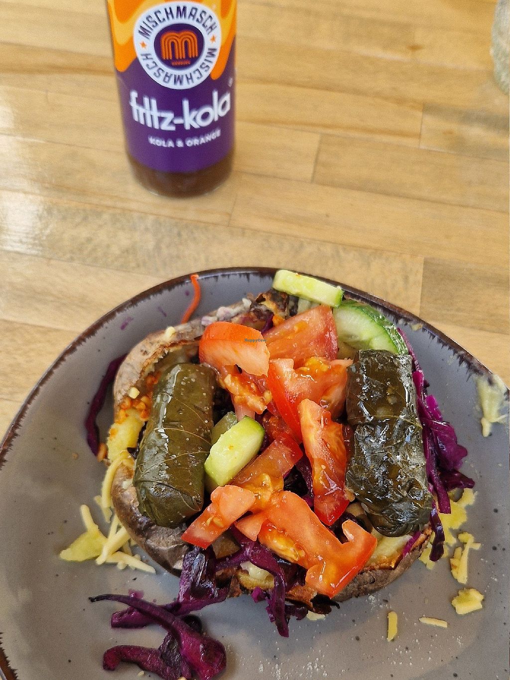 Es gab verschiedene fertige Gerichte auf der Karte, welche allerdings (fast) alle nicht vegan waren. Jedoch konnte man sich seine Toppings selbst zusammenstellen, welche aus einer großen Auswahl an Gemüse bestanden. Es gab auch verschiedene vegane Soßen und die Kartoffel wird mit veganem Käse gebacken. Ich hatte die Curry-Soße., welche sehr gut geschmeckt hat.