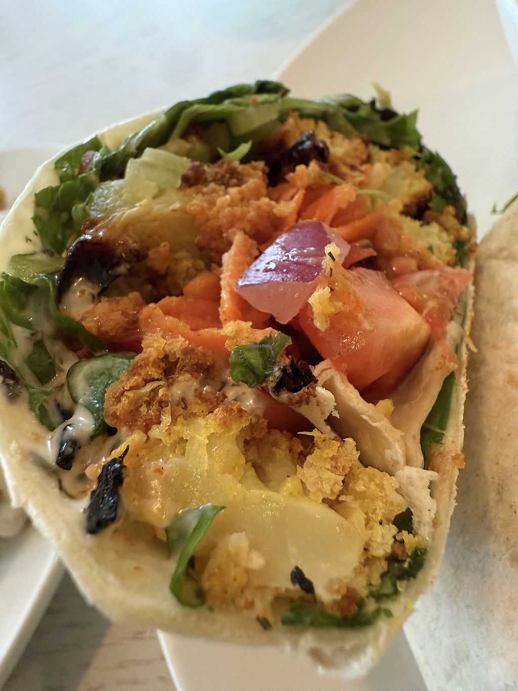 Always forget to leave reviews for the non out of state restaurant visits. So I wanted to make sure I left one for here. I have been meaning to make it here for a while and it did not disappoint. Everything was very tasty and had big portions. It is definitely worth a return drive. I got the Homemade chickpea patty crunch wrap and an apple cinnamon whoopie pie, which were both excellent. It was a very cute shop with some out door seating. Good experience and well come back.