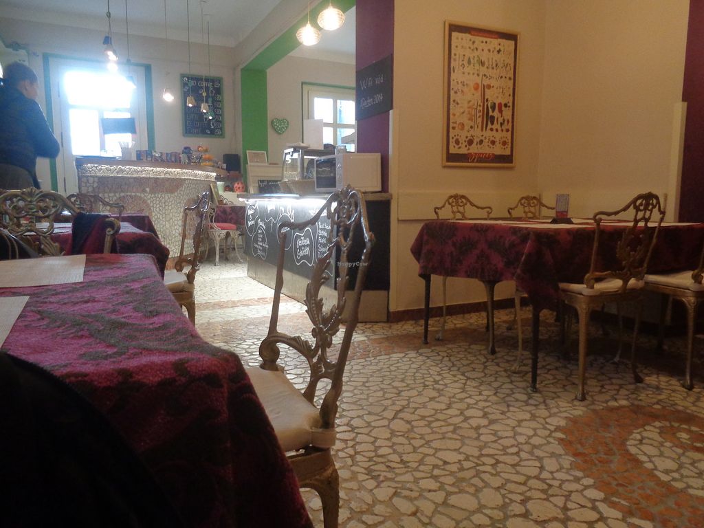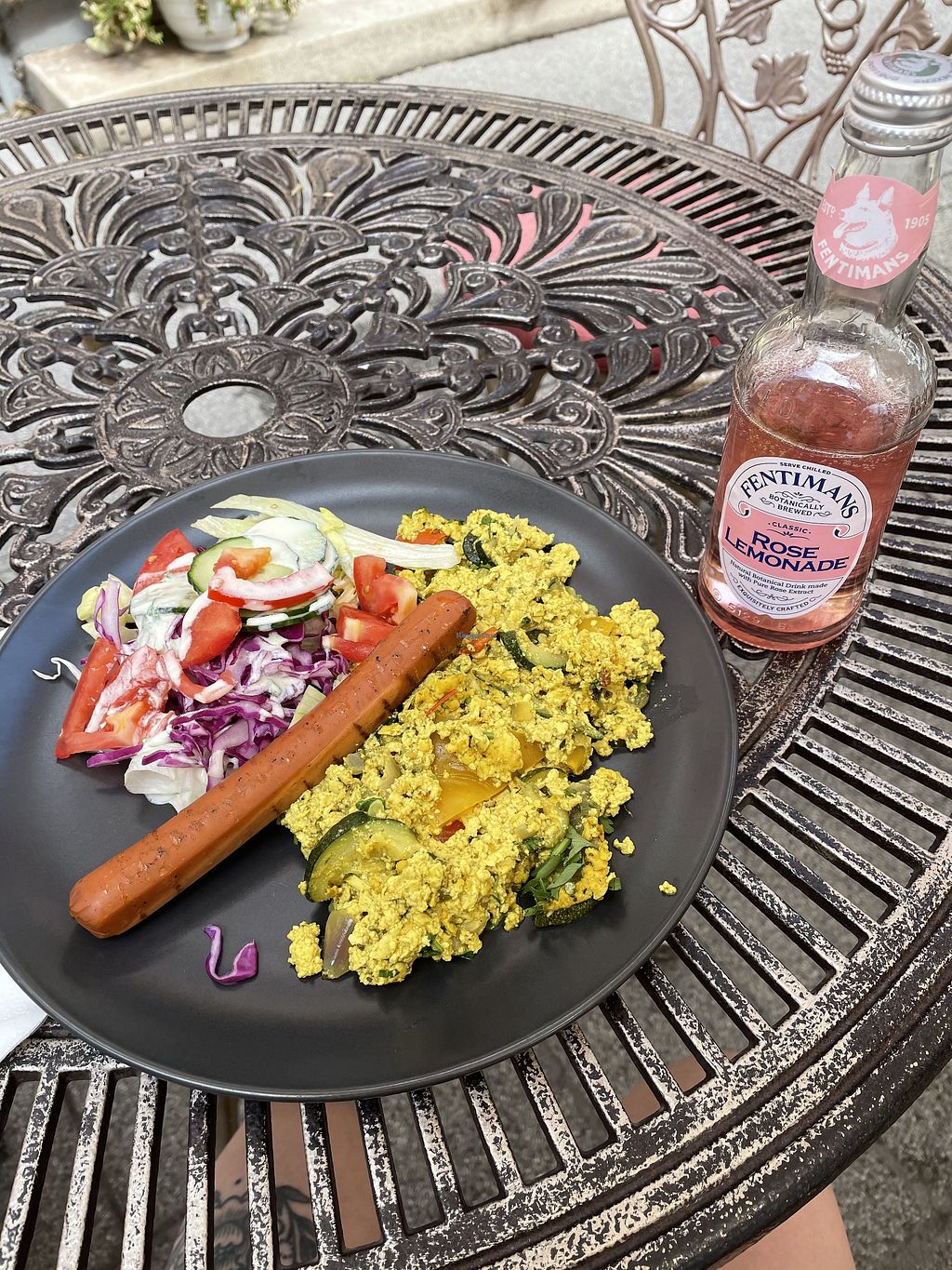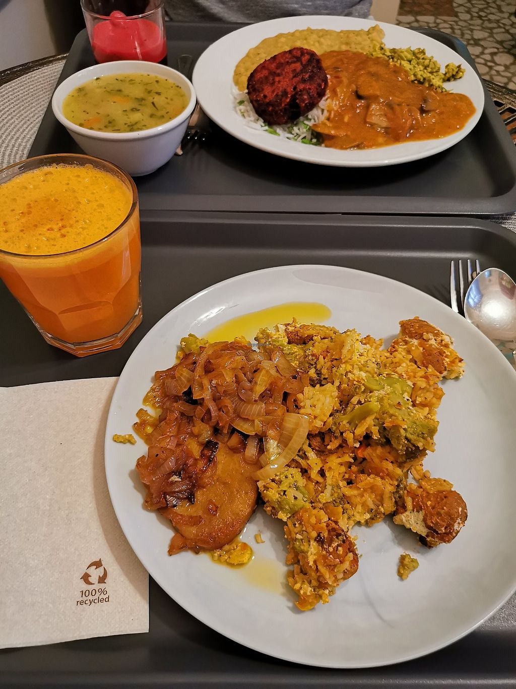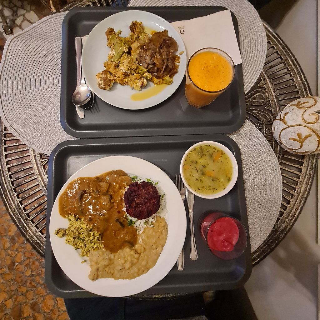 cappuccino with coconut milk and palacsinta pancakes with plumb jam