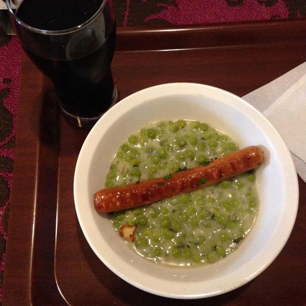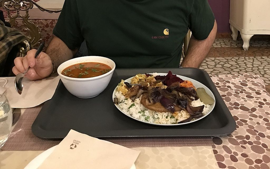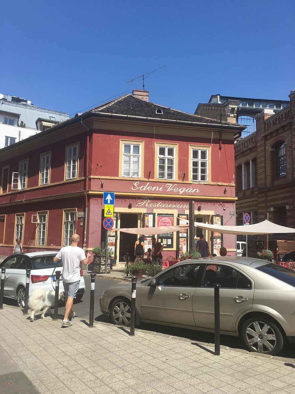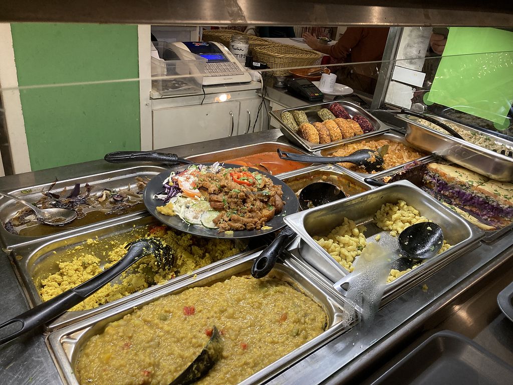 cappuccino with coconut milk and palacsinta pancakes with plumb jam