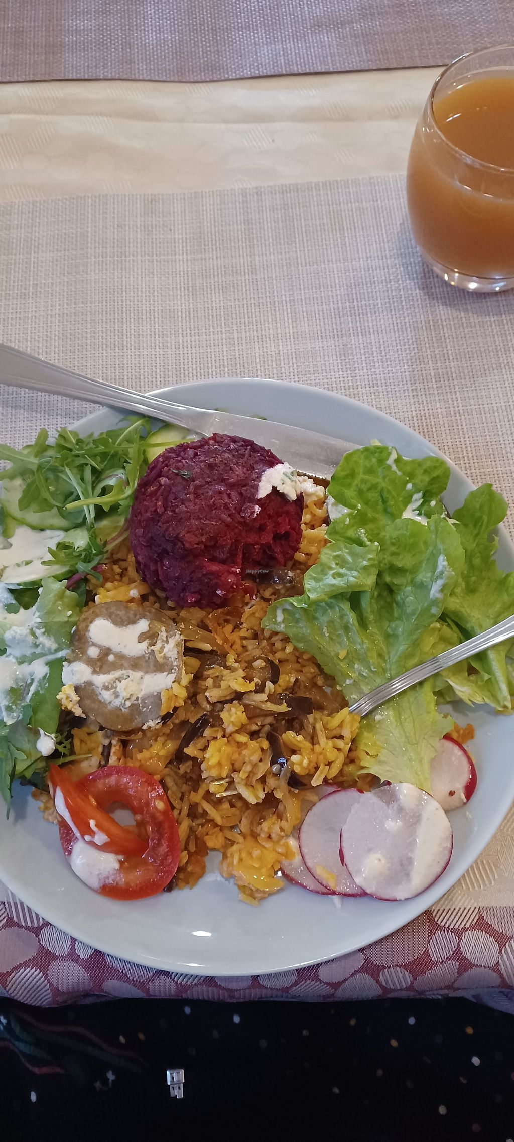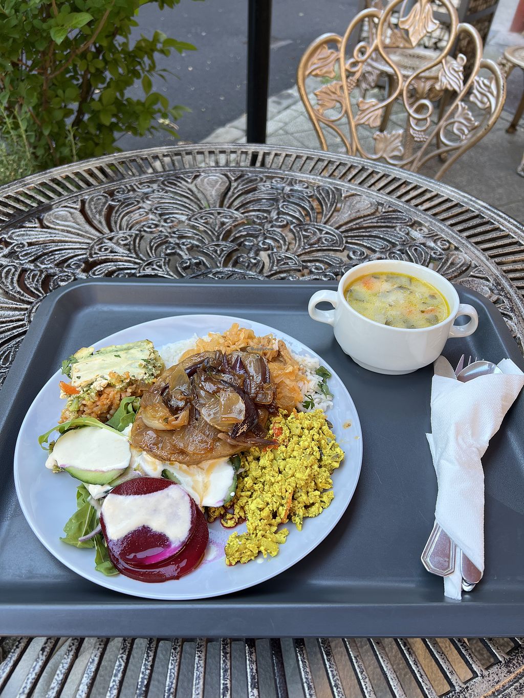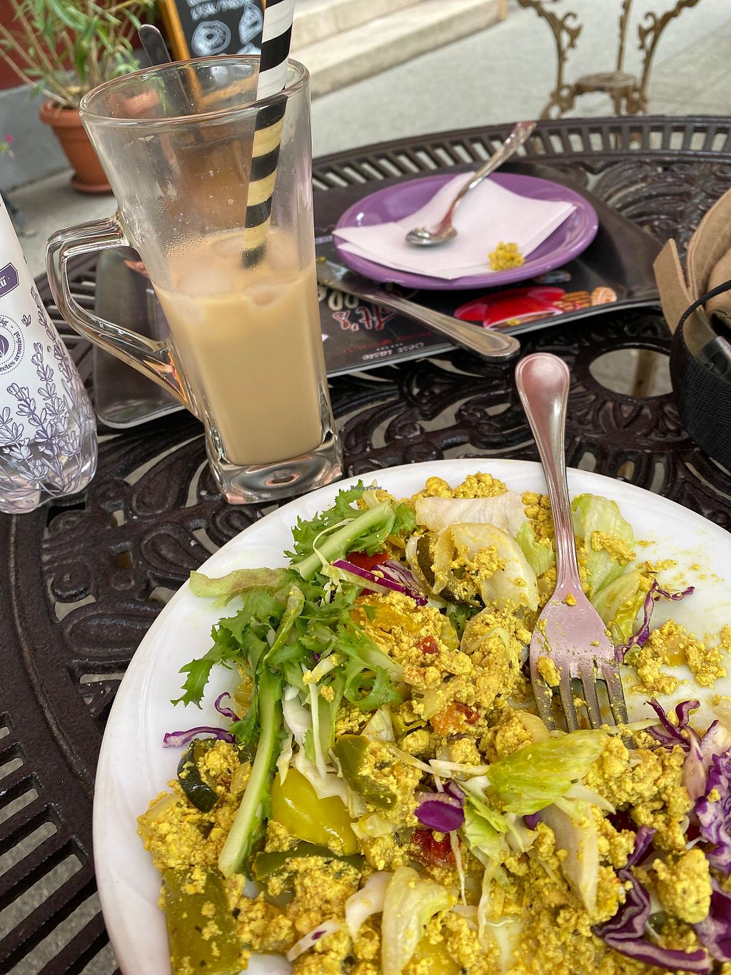 Veg patty, tofu scramble, sauerkraut, salad