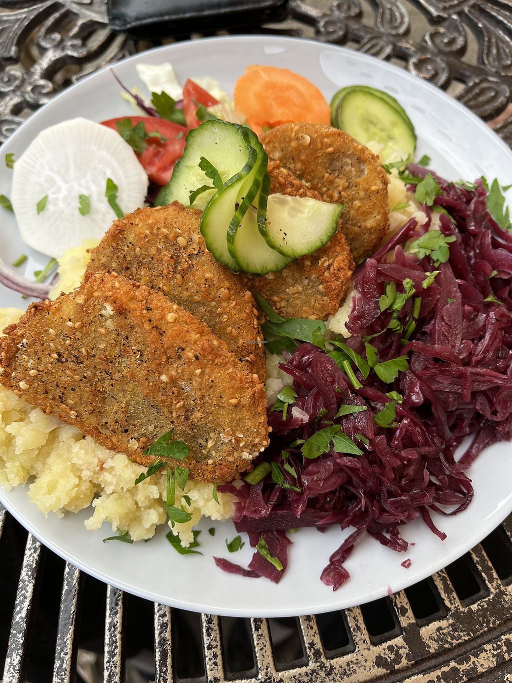 fried seitan with potatoes and side coleslaw and salad