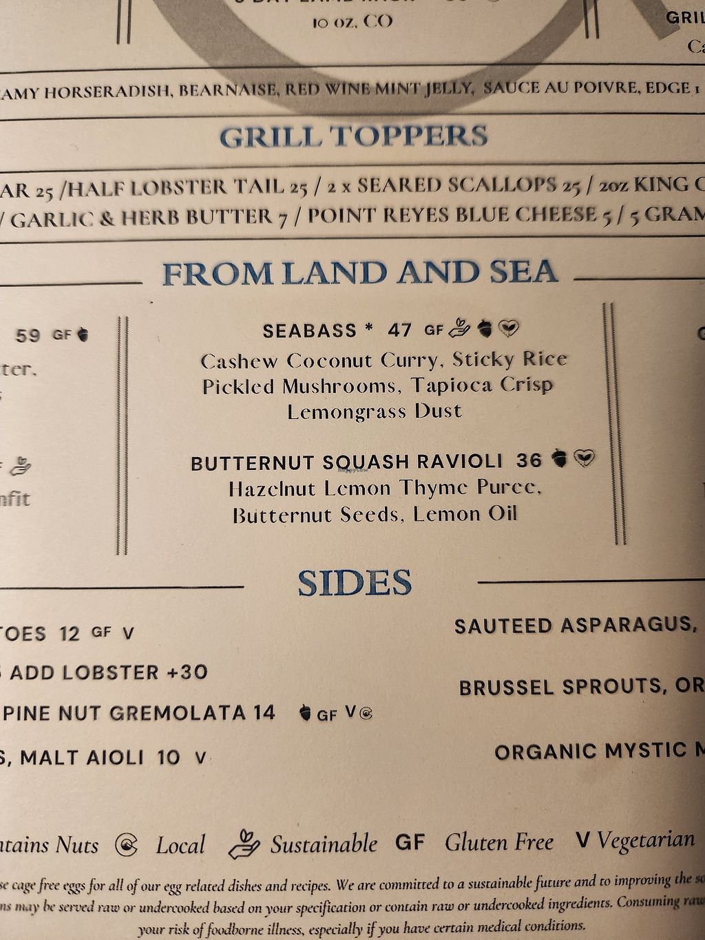 Their butternut squash ravioli is their go-to vegan entree. There were vegan brussel sprouts as a side that I did not try. They also have a wonderful cranberry almond cake. The server was so lovely and helpful in pointing out the options and emphasizing that they want all diners to have real options to enjoy themselves.