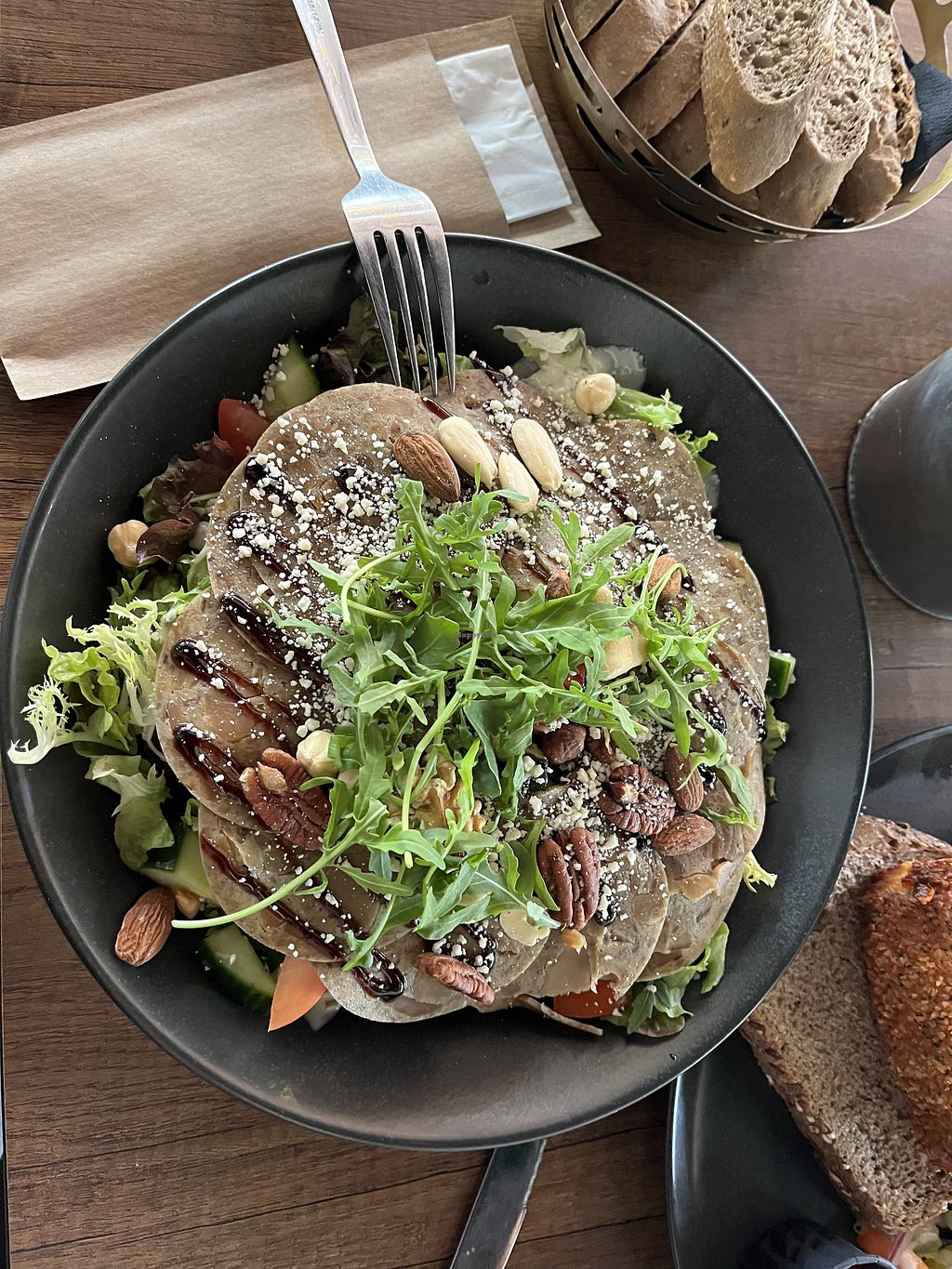 Tempeh sateh with cabbage and emping (nice). Comes with side salad and…