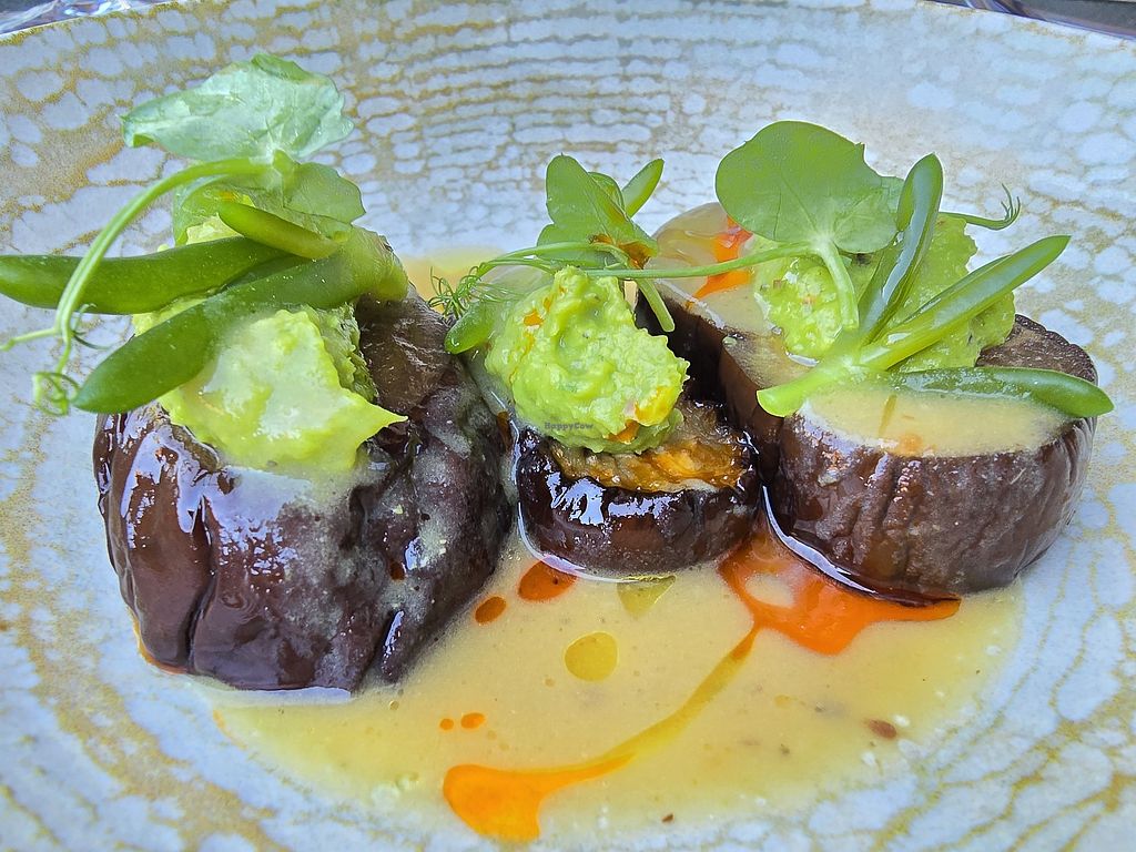 Aubergine brochette witte boon créme / groene appel