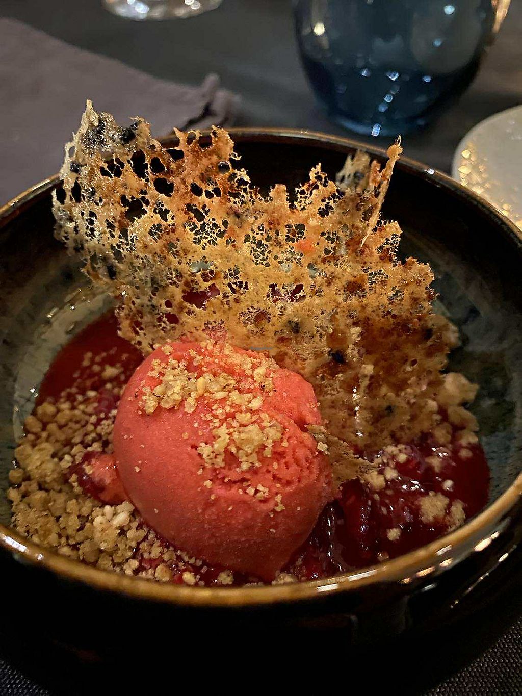 Framboos sorbetijs / sesam crumble